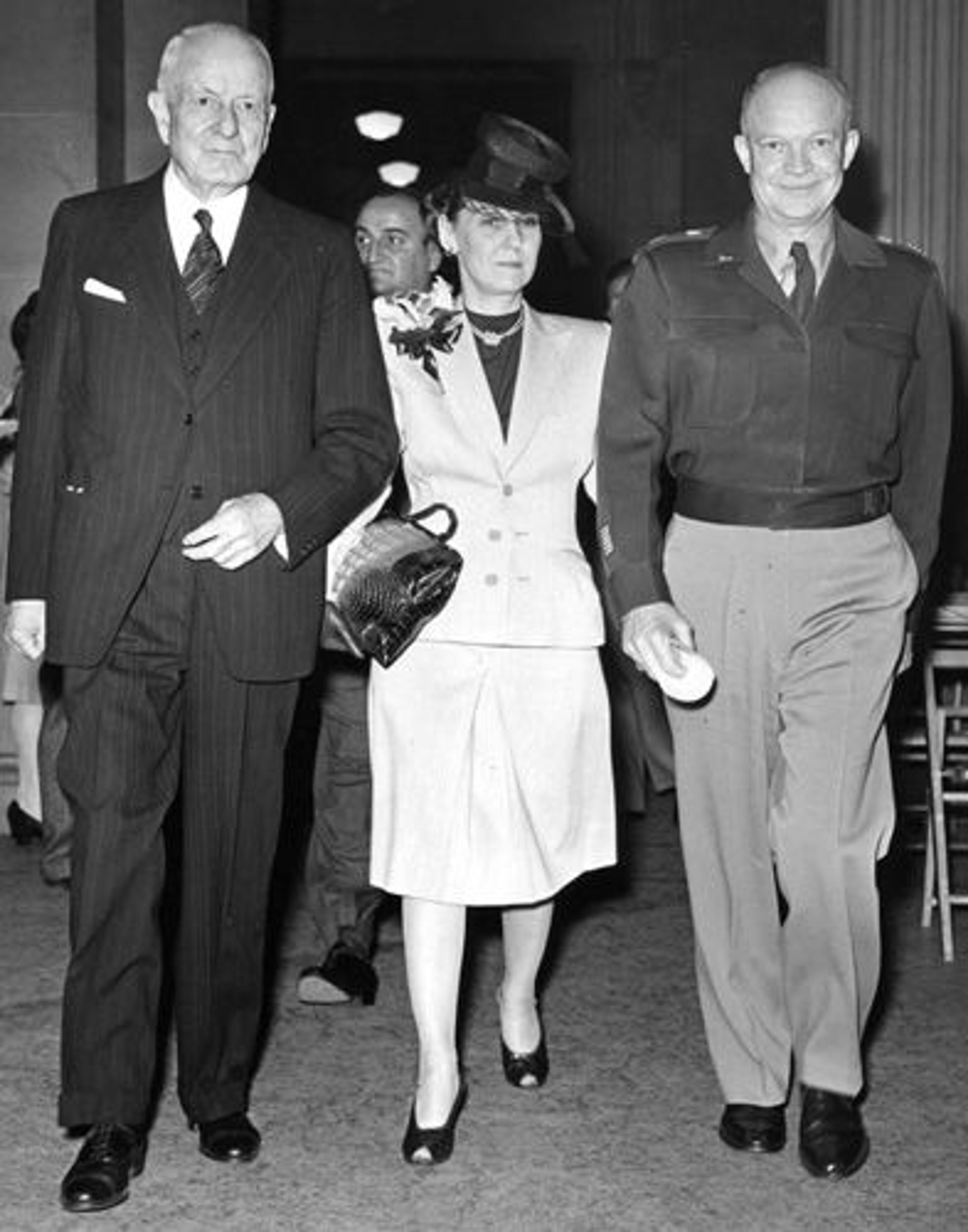 Right: Thomas J. Watson, Mrs. Eisenhower, and General Eisenhower arriving at the Museum on April 2, 1946