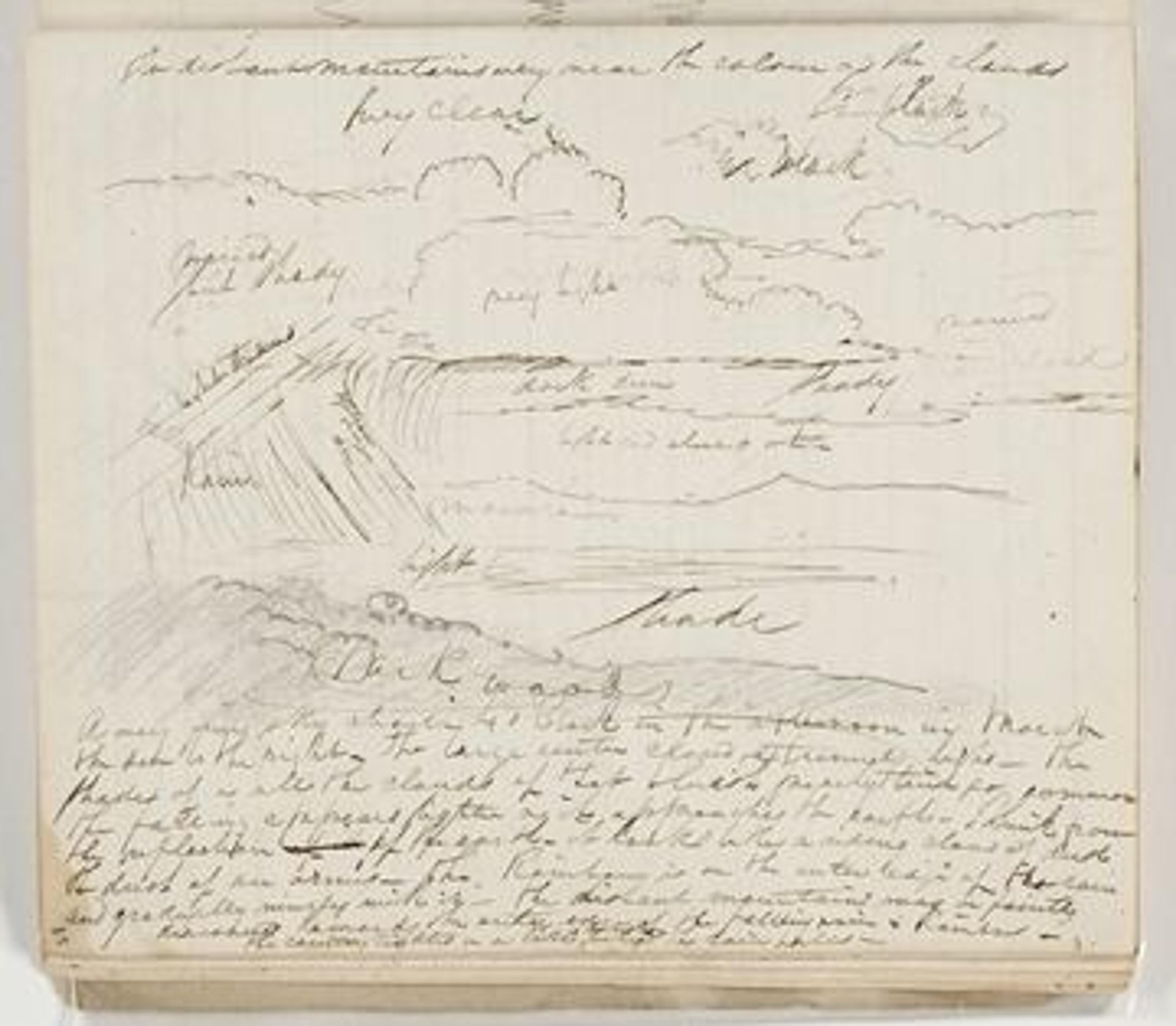 Thomas Cole—the subject of a recently closed exhibition at The Met, traveling soon to The National Gallery, London—studied, sketched, and painted clouds throughout his career. As early as 1825, he copied in his notebook the formula for painting skies found in William Oram's Precepts and Observations on the Art of Colouring in Landscape Painting (1810), and his notebooks are filled with written empirical observations as well as graphite on-site studies of clouds, such as Atmospheric Study with Notations, which he inscribed, "Thunderstorm after Sunset."