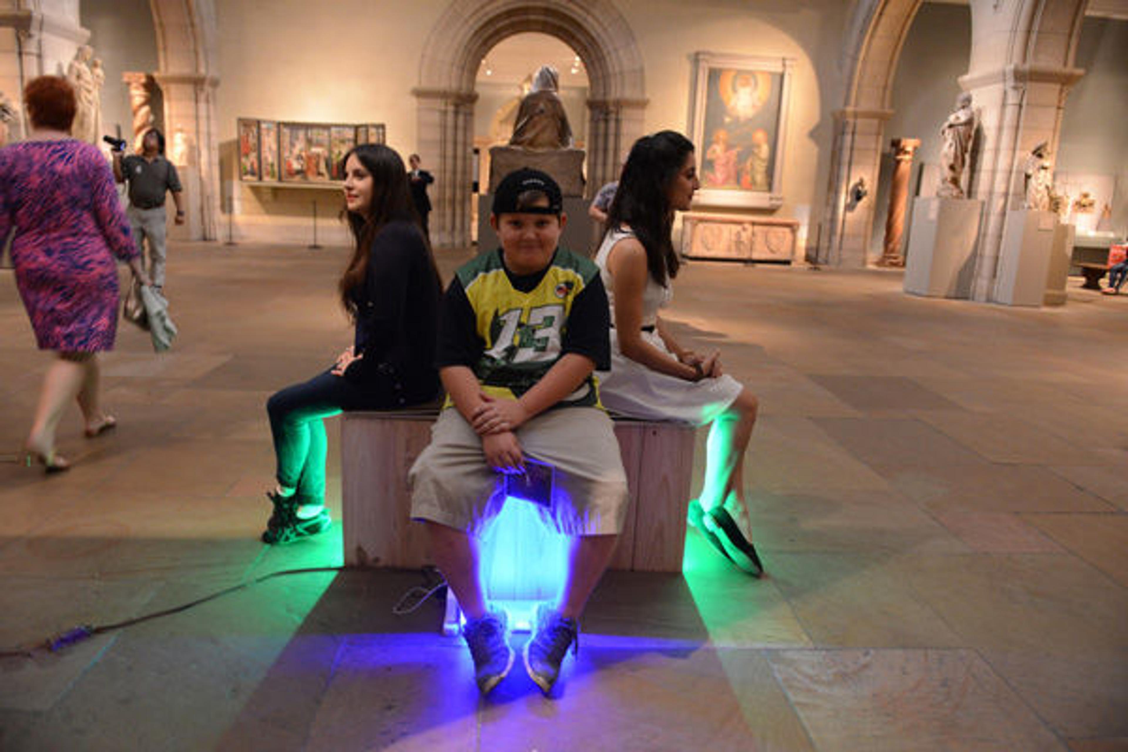 Satisfied with my free tote bag (now the envy of my mother and brother), I then headed toward The Temple of Dendur, and as I passed through the galleries of the Department of Medieval Art, I found the MediaLab's set up. Digital media artist Isabel Paez created Musical Benches—an audio and visual experience using a tune inspired by medieval music split up into four parts: two violas and two cellos. As a violinist, I was interested in trying it out. When a person sat on one of the four seats, one of the four instruments played and the seat lit up. We had to sit on all four seats to play the entire tune.
