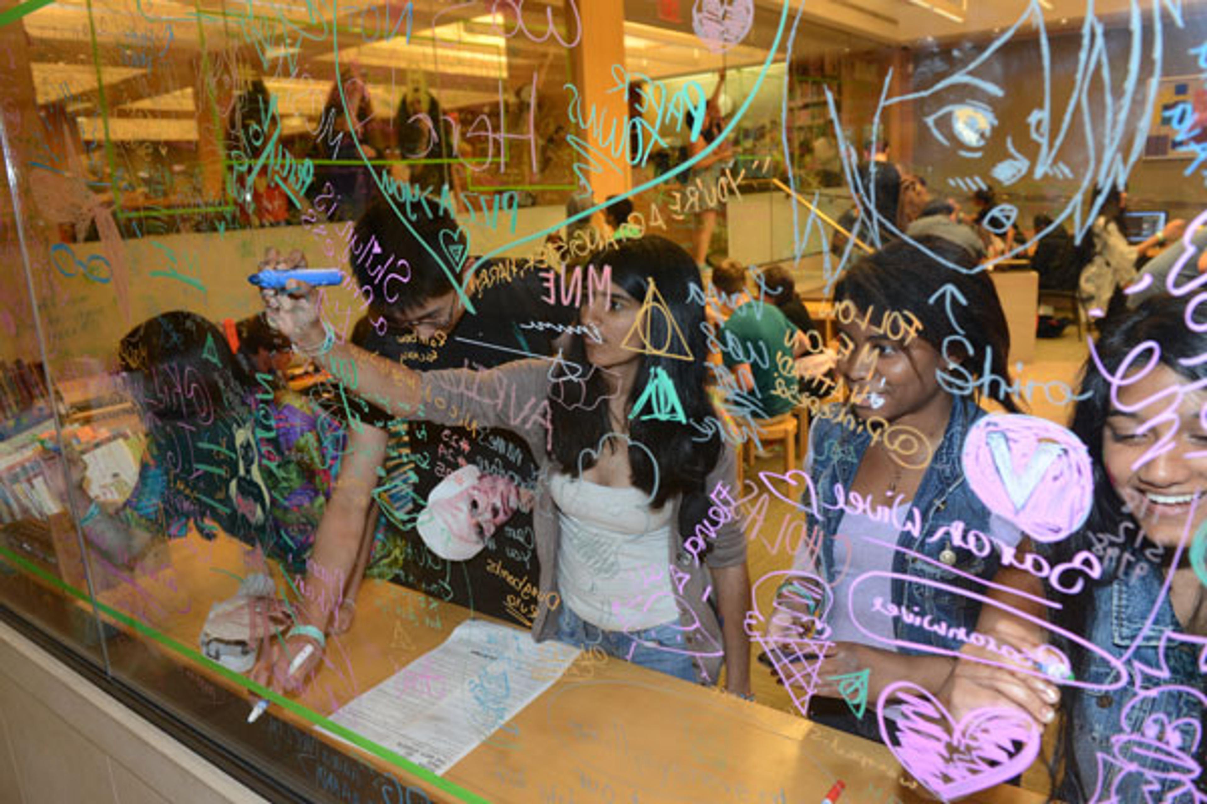 Teens writing on the glass walls of Nolen Library