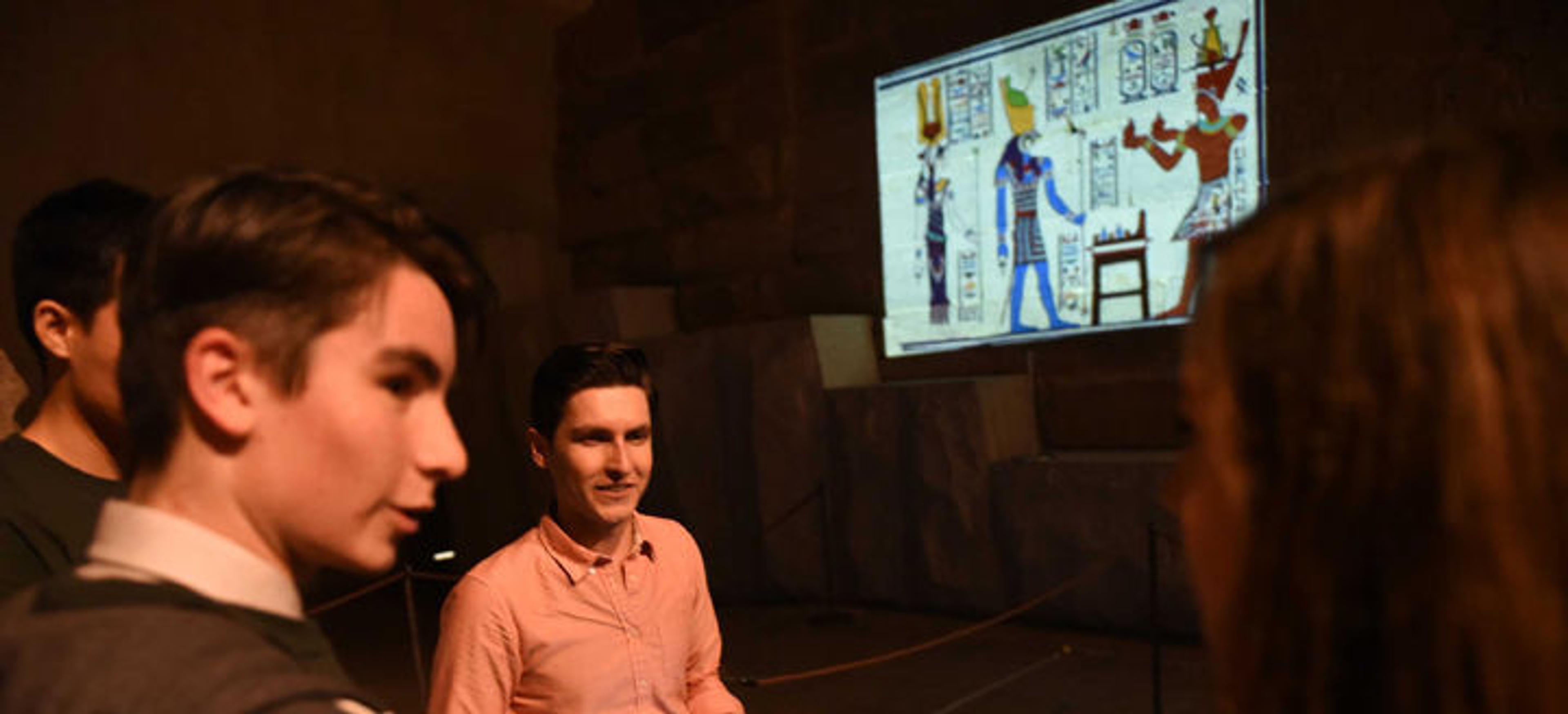 Teens witnessing a projection of the colors that would have originally been on The Temple of Dendur in Color The Temple, a project designed by The Met's Media Lab. Photo by Don Pollard
