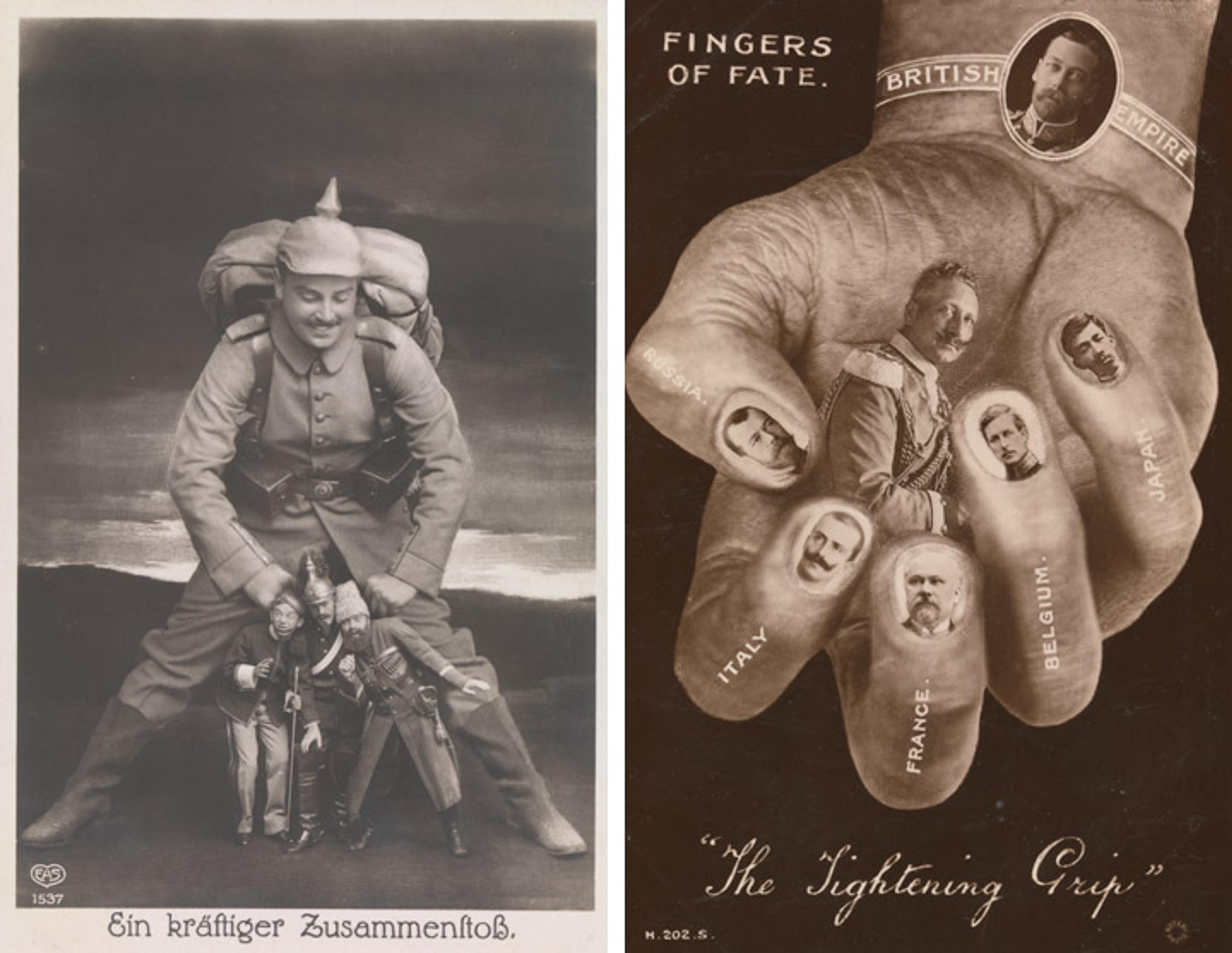 They could be imbued with humor, as in A Powerful Collision, which shows the German soldier knocking together the heads of doll-like figures representing France, Britain, and Russia. You don't get a sense of death or destruction; it's more like a cat's game of playing with toy mice without real consequences or death. The same is true for Fingers of Fate—The Tightening Grip; there's no real threat of physical violence. It's a sanitized version of what the war was, but these images, along with other postcards showing zeppelins flying above cultural icons and monuments, were designed to inspire the members of the country that issued the card, as well as to instill fear in the country depicted. There's something about these postcards that could maintain an enthusiasm because they were so affordable, easy to mass-produce, and they could be carried to war, collected, and exchanged.