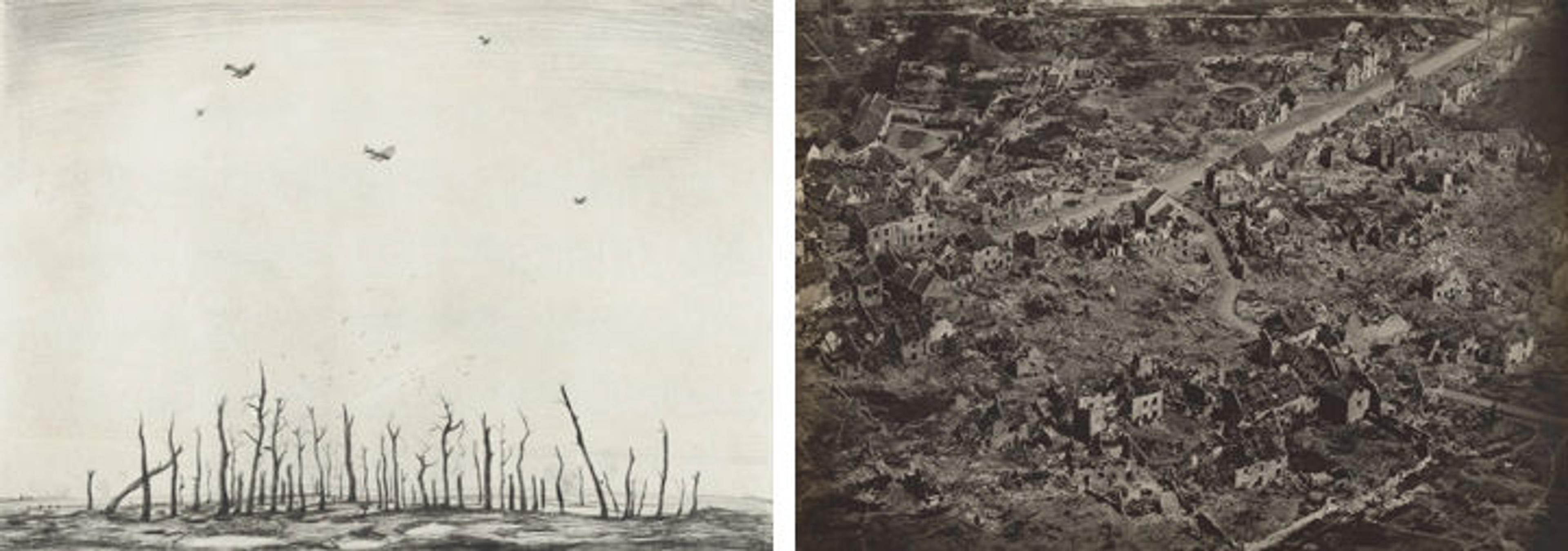 Left: Christopher Richard Wynne Nevinson (British, 1889–1946). That Cursed Wood, 1917. Drypoint, image: 9 13/16 x 13 3/4 in. (24.9 x 34.9 cm). Collection of Johanna and Leslie Garfield. Right: Edward J. Steichen (American [born Luxembourg], 1879–1973). Aerial View of Vaux, France, After the Bombing Attack, 1918. Gelatin silver print, image: 37 x 48.6 cm (14 9/16 x 19 1/8 in.). The Metropolitan Museum of Art, New York, Gilman Collection, Purchase, Joseph M. Cohen Gift, 2005 (2005.100.445). © 2017 Artists Rights Society (ARS), New York