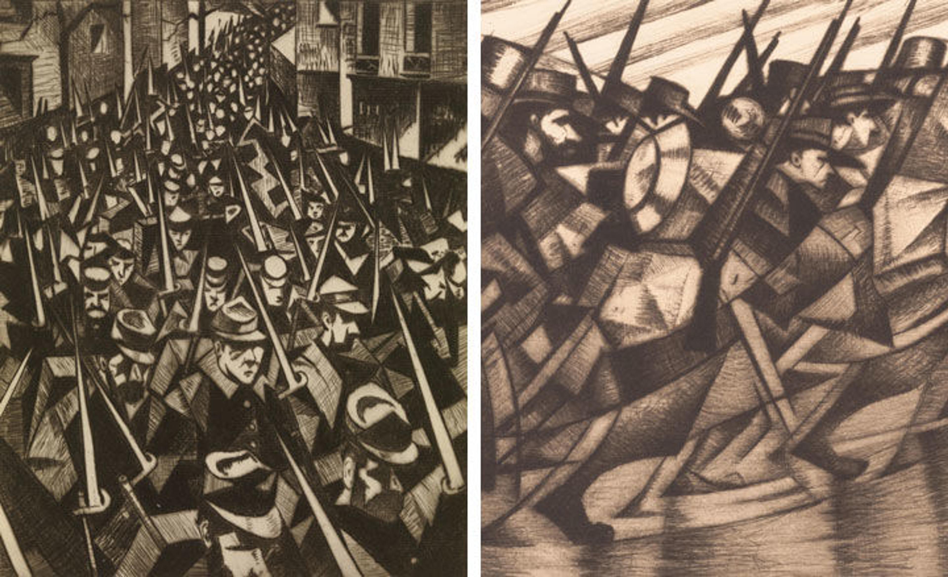 Left: Christopher Richard Wynne Nevinson (British, 1889–1946). A Dawn 1914, 1916. Drypoint, image: 6 15/16 x 5 3/4 in. (17.6 x 14.6 cm). Collection of Johanna and Leslie Garfield. Right: Christopher Richard Wynne Nevinson (British, 1889–1946). Returning to the Trenches (detail), 1916. Drypoint, plate: 6 x 8 1/16 in. (15.2 x 20.4 cm). The Metropolitan Museum of Art, New York, Rogers Fund, 1968 (68.510.3)