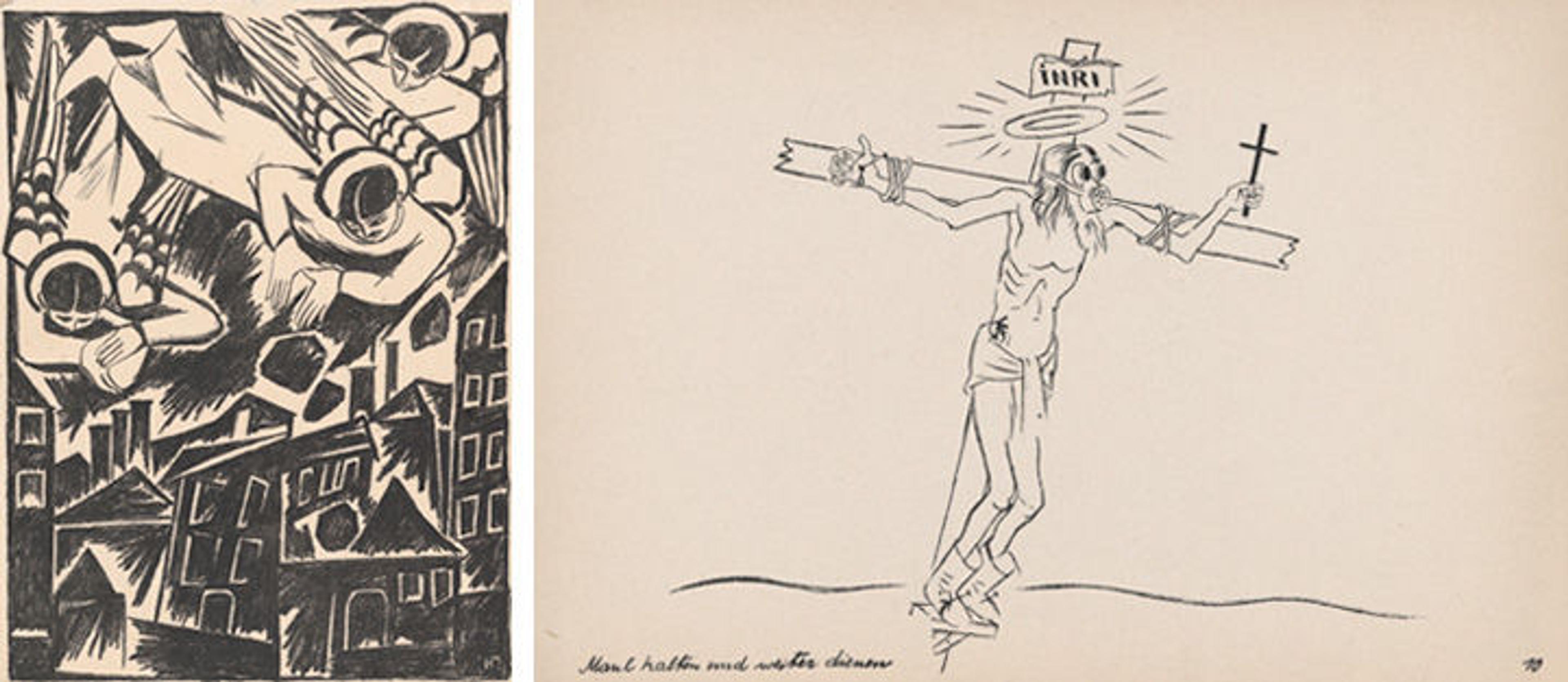 Jennifer Farrell: That's right. Goncharova's angels hurling boulders evoke Babylon; it's vengeful and they are taking sides. But now you see various references to Christ the humanitarian, and even as a victim. It's like you say, the Christian iconography is still present but has transformed. In fact, Grosz and his publisher were charged with anti-clerical activity—and that's likely what Grosz intended. He talked about the image of Christ shown here—wearing a gas mask and soldier's boots, holding a crucifix—being a vision. The print right before this shows those who professed to follow him, such as the minister spewing bullets while on the pulpit below him is the image of the lamb of God, moving far away from the church's mission and doctrine of peace, mercy, humanity; this is really what Grosz is condemning and in the strongest terms. So in that decade that followed the armistice, you see a turning of the lens onto these institutions Grosz and others deemed responsible for the war or for at least fanning the flames: clergy, businesses, government officials, those they held responsible for the drumbeat of war and who most profited from it.