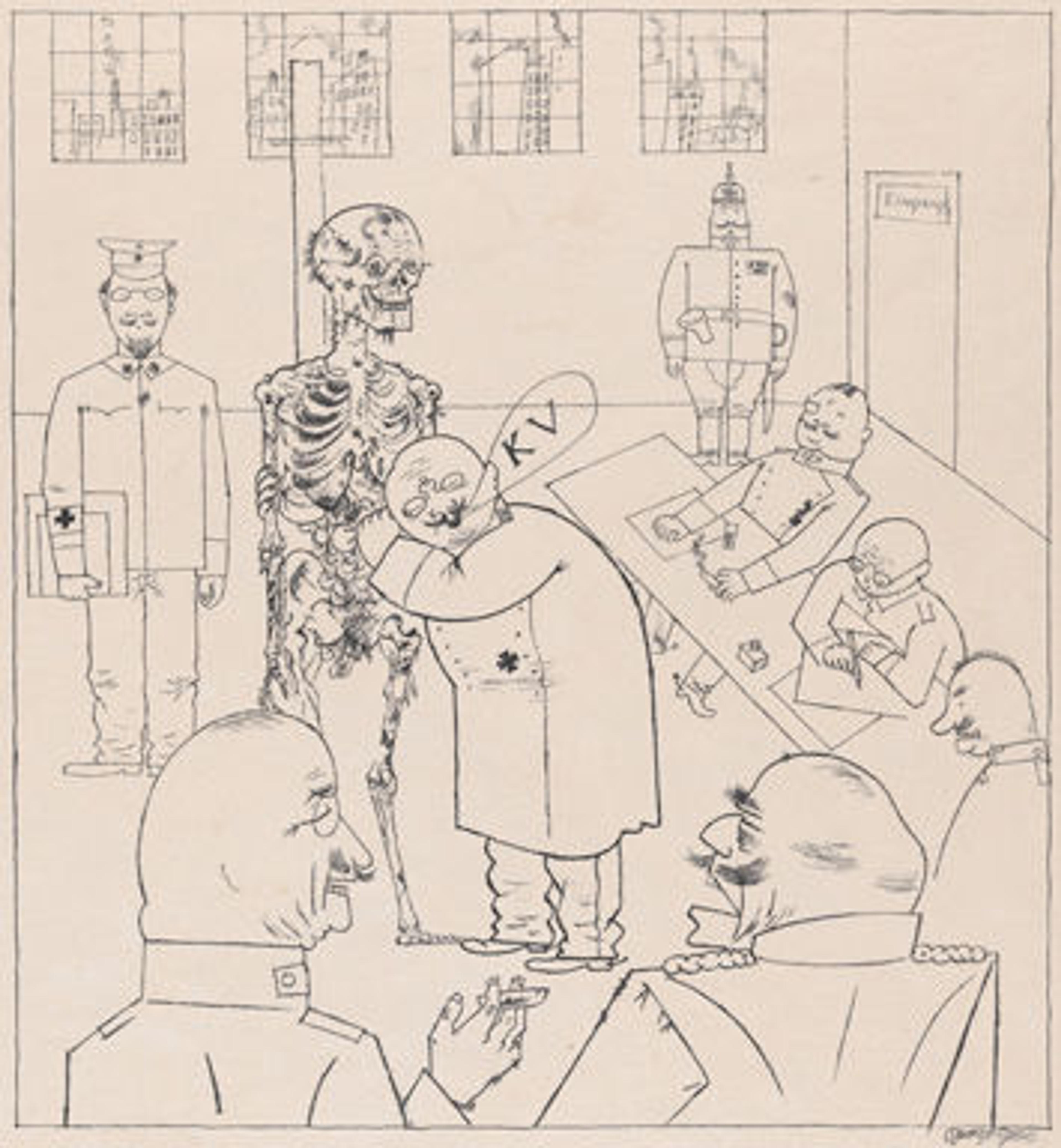 You have this with Grosz—who was opposed to the war and nationalistic politics even before the fighting began—who nonetheless was conscripted and had a breakdown before seeing the front lines. He was hospitalized and would be brought before the medical review board every so often, beaten up by other soldiers, and threatened with having to serve. German Doctors Fighting the Blockade is likely a self-portrait—you can see this in the glasses that resemble Grosz's worn by the skeleton—and the doctor is pronouncing "K.V.," which meant that the skeleton was fit to serve. It's definitely a reference to Grosz's own experience. You see this with the Heckel with the bandages on the head and the scars of the face, it conflates the external and internal damage, and then the inclusion of the cross behind him makes reference to martyrdom.