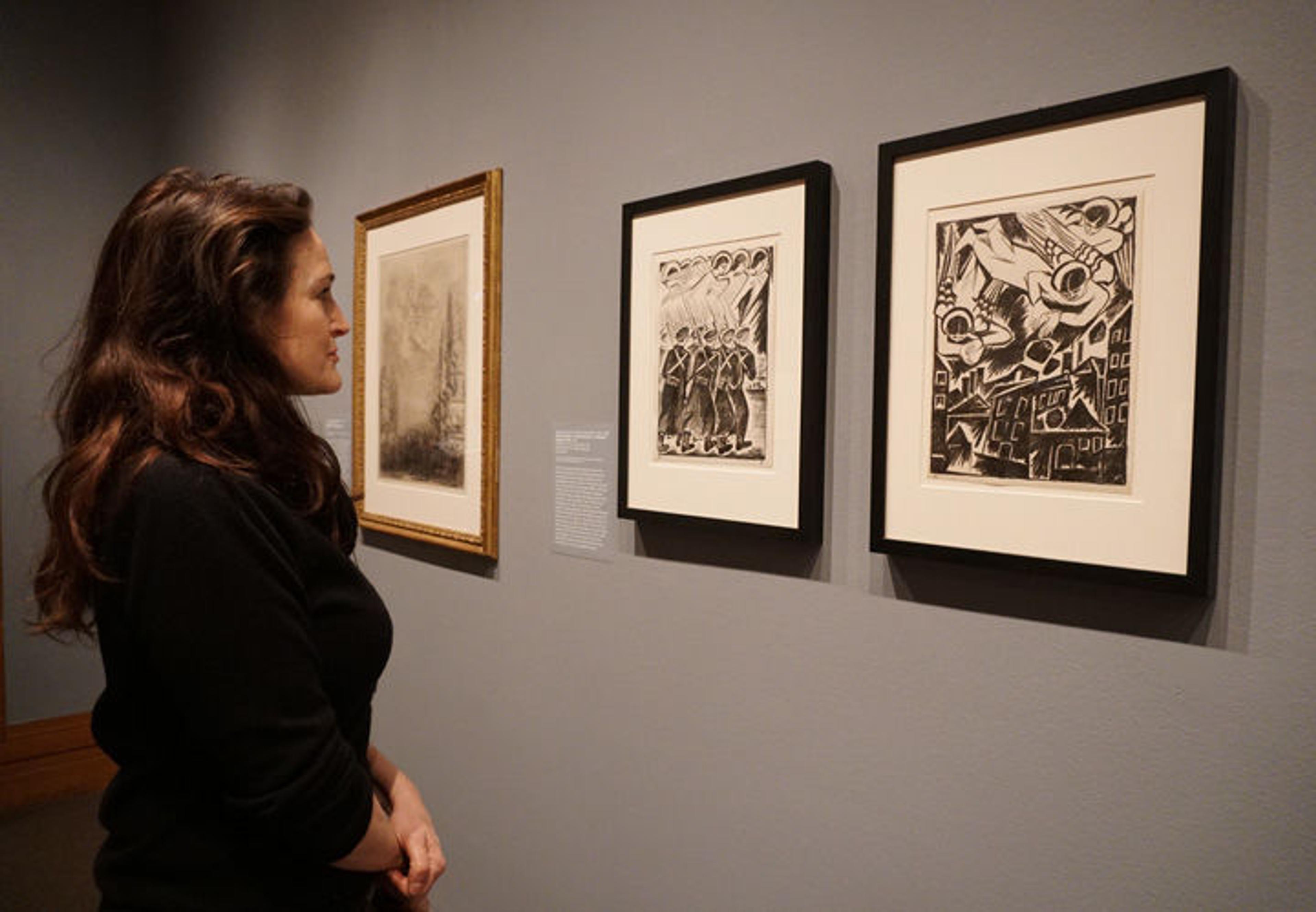 Associate Curator Jennifer Farrell in the "Mobilization" gallery of World War I and the Visual Arts