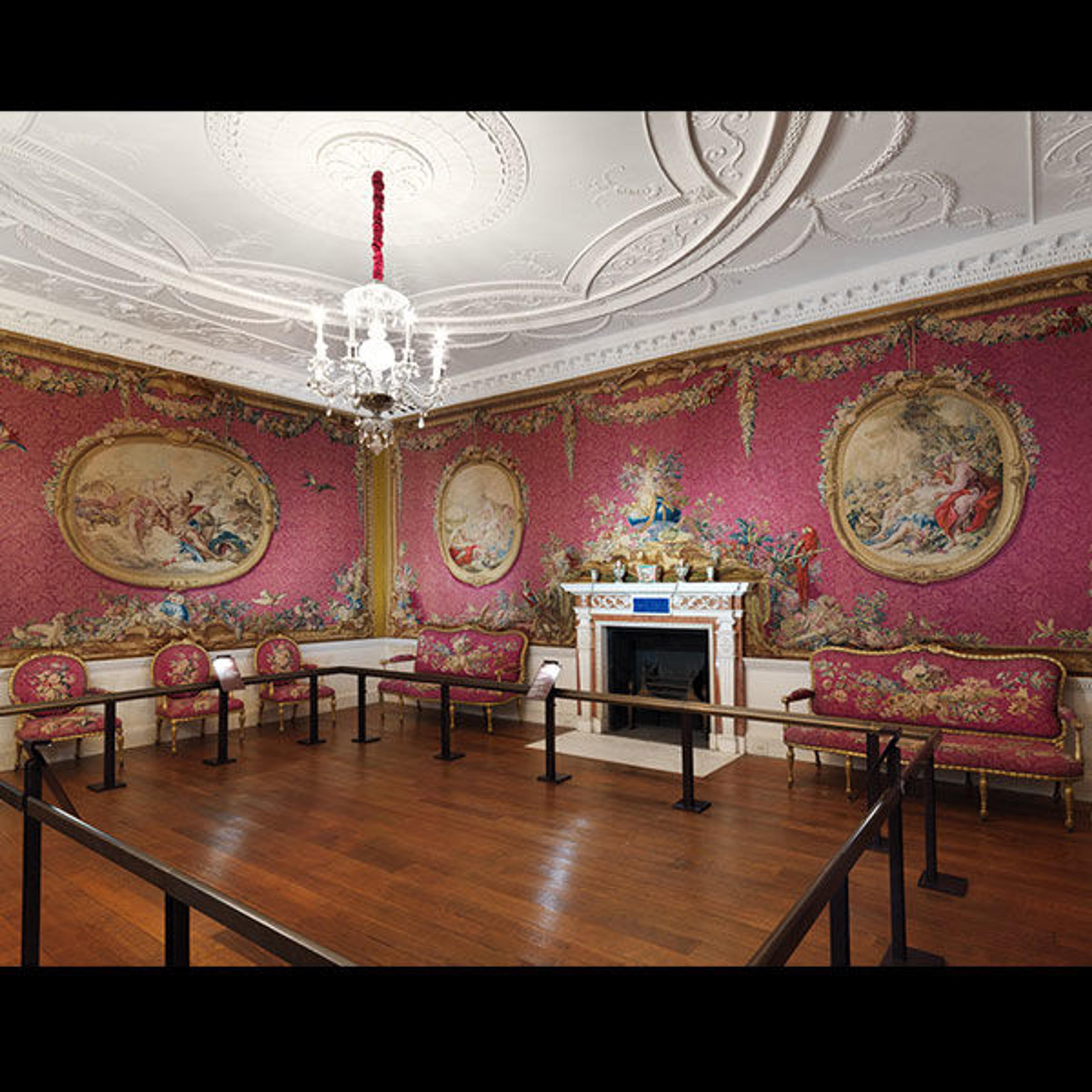 WOLF BURCHARD: As soon as the borders were reopened, Coventry rushed to the Gobelins tapestry manufactory, and commissioned this suite of tapestries that was partly designed by Francois Boucher, a great eighteenth-century painter whose paintings here are rendered in tapestry, in these very gutsy Rococo frames. They created this illusion that these pictures are hanging over a crimson, silk damask.