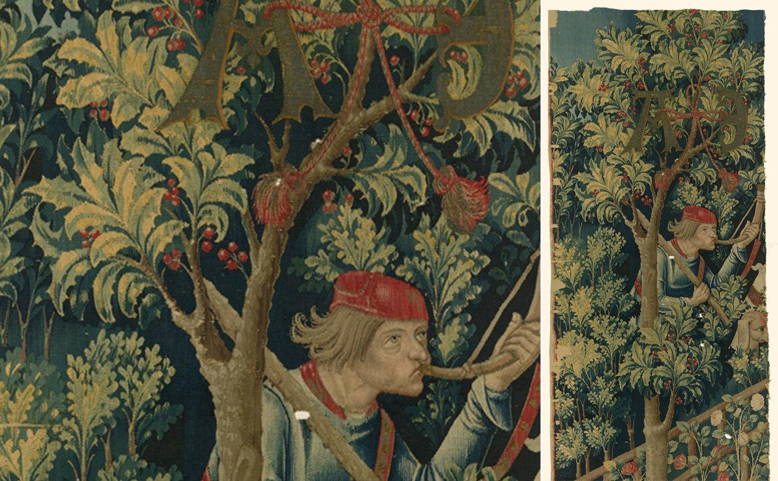 Holly is a dominant tree in the wooded landscapes of the Unicorn Tapestries and appears in all but the first and last of the seven in the set.