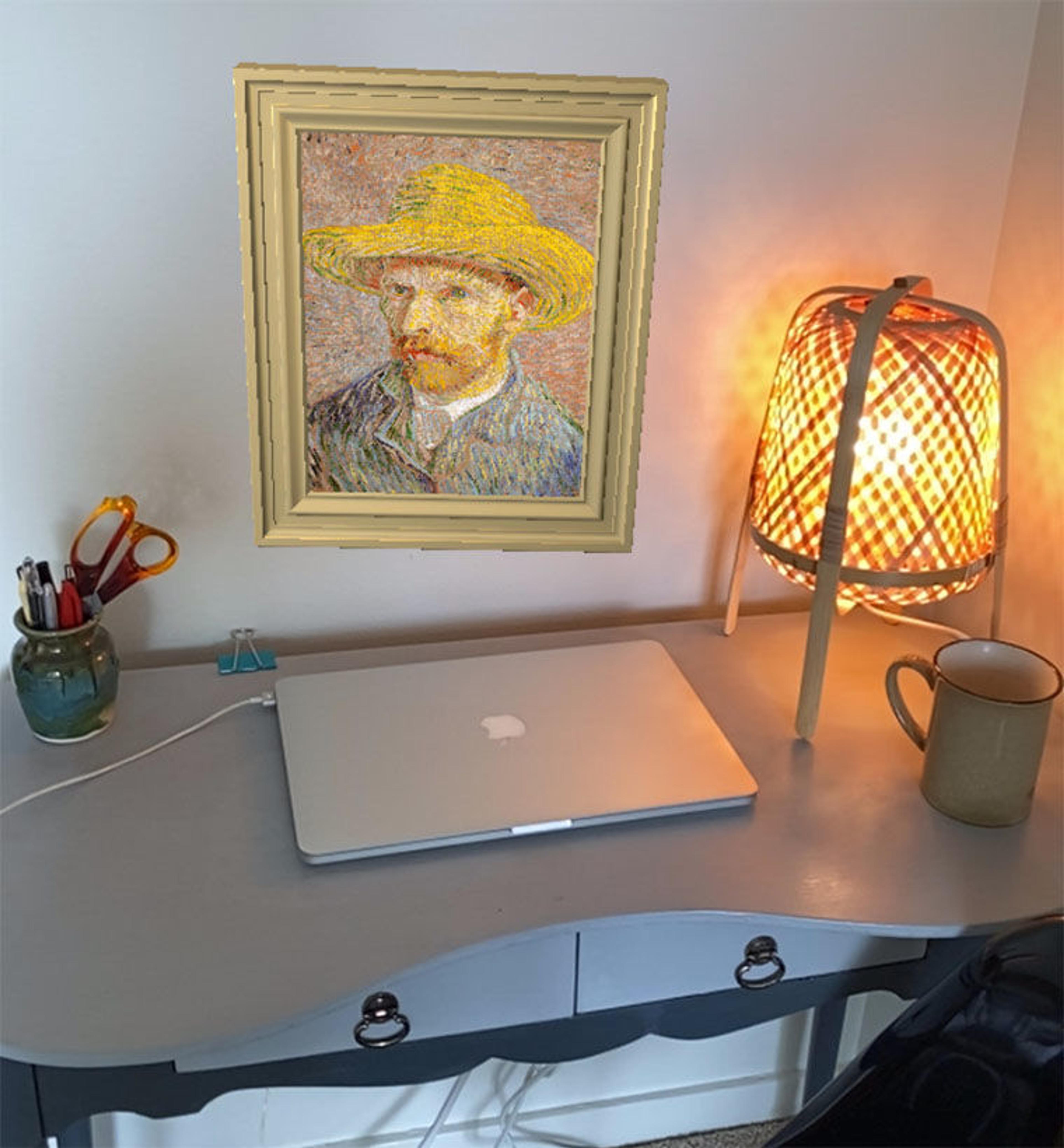 When van Gogh lacked money for models and fresh canvas, his ingenious workaround was to paint self-portraits and reuse old canvases. As you explore van Gogh’s lively self-portrait in bold colors, turn this canvas around to discover the other side.