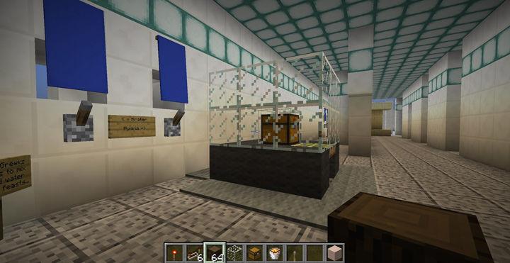 Back in the classroom, students loaded /Metcraft on their computers and began the game in a Minecraft replica of the Great Hall. From there, they navigated to the "Minecraft-ified" Greek and Roman art galleries, in which players could find locked display cases, each with a treasure chest inside, in the same locations as the original objects from part one. Beside the cases were a sign and two levers. The sign quizzed their knowledge of the art object. For example, one in-game sign stated: "This mythological beast was famous for its riddle." One of the levers allowed the player to answer with "sphynx" (the correct answer), while the other was for "centaur." If the player answered correctly, the display case opened, revealing a treasure chest and loot. If the player answered incorrectly, a secret door opened and monsters swarmed out and attacked them.