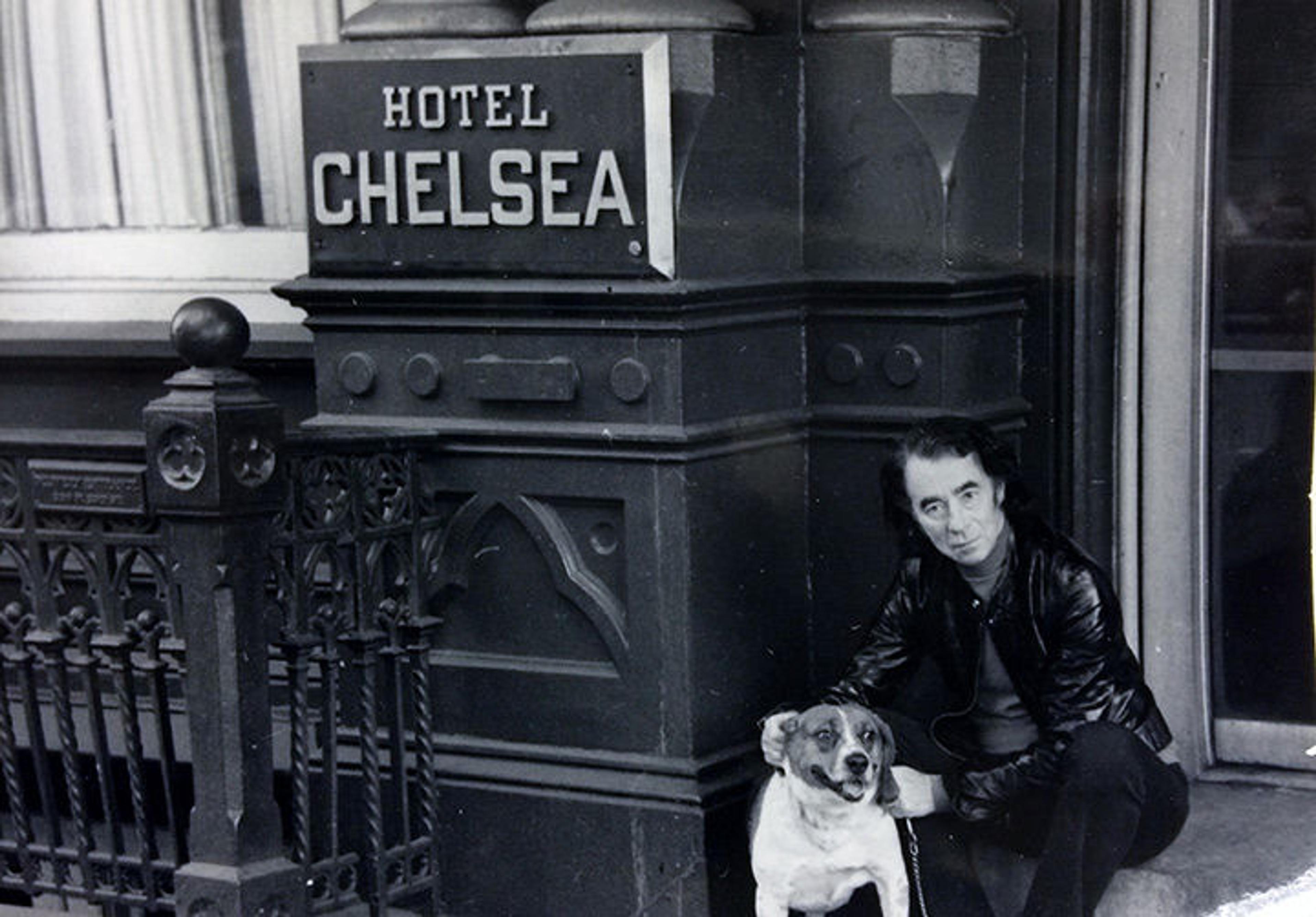 Charles James and his dog Sputnik, circa 1975, in front of the Chelsea Hotel. Photo by Barbara Walz. Photo from the Charles James Papers
