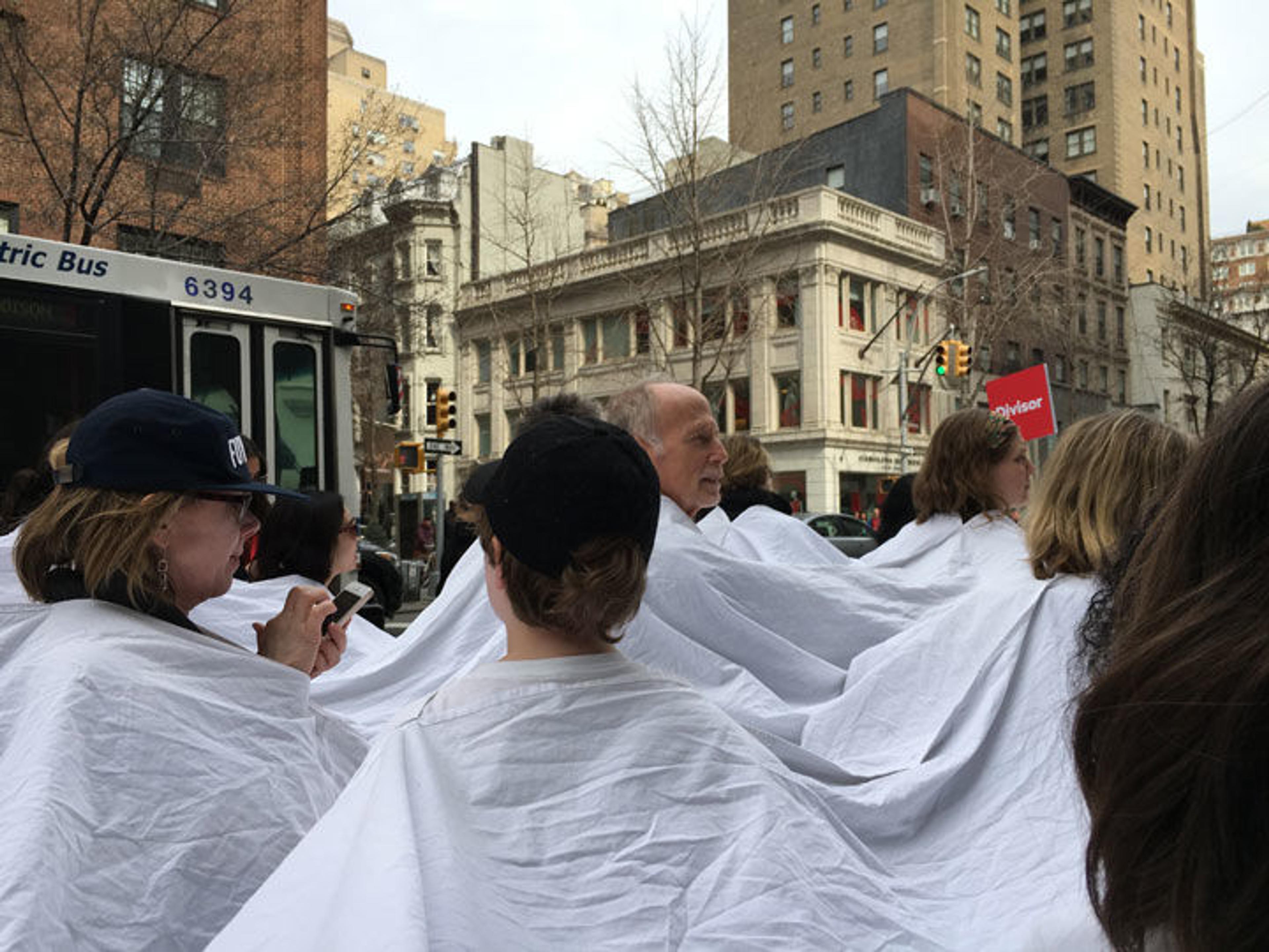 In front of The Met Breuer, I joined about 60 others in poking our heads through holes in a large "blank canvas," which obscured views of our bodies and limited the use of our hands. Together, we set off in a closed lane of traffic up Madison Avenue to 79th Street, where we crossed over to Fifth Avenue and concluded our trip in front of The Met Fifth Avenue.