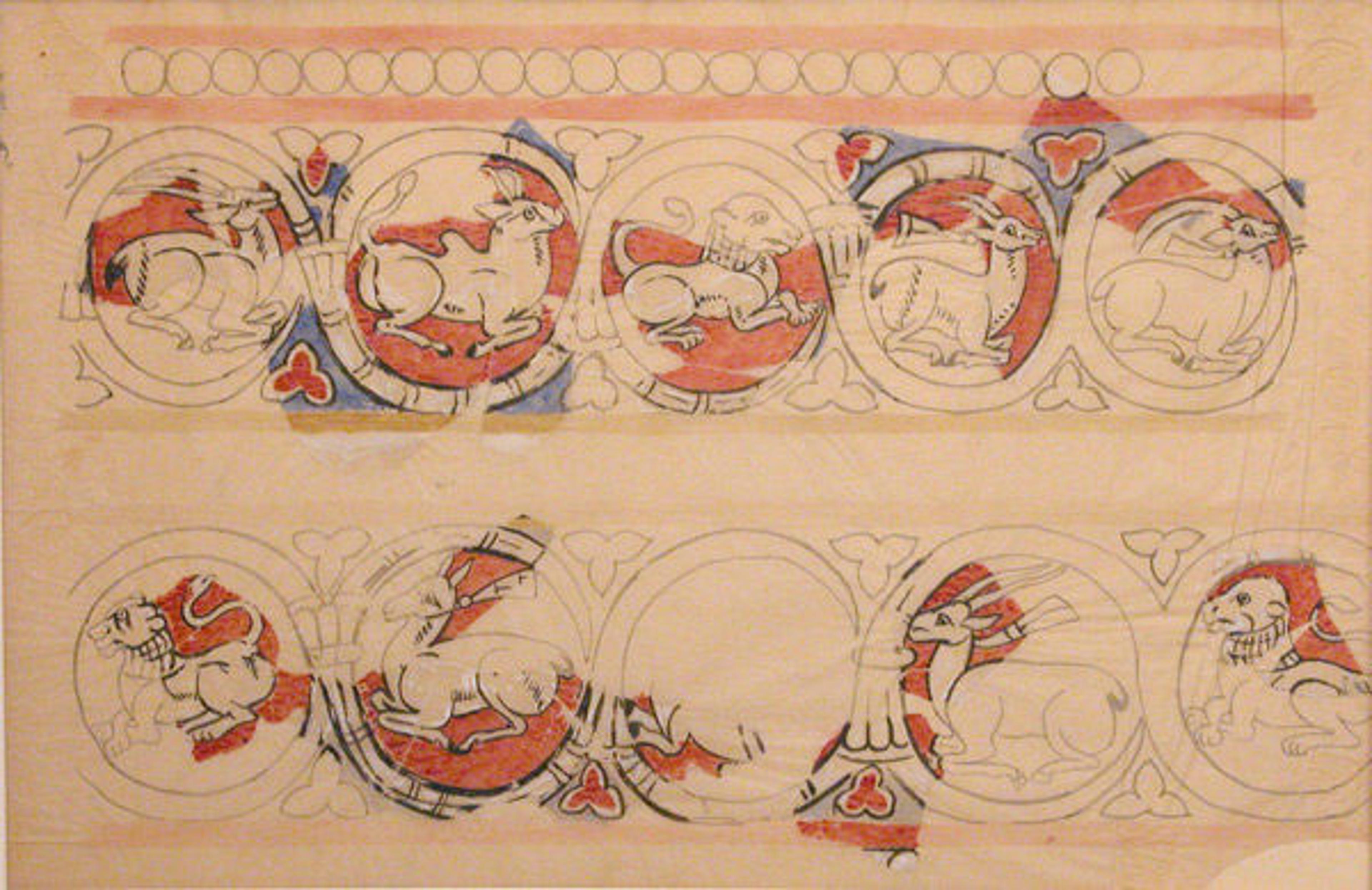 Herzfeld then made copies of these cutouts using tracing paper and pasted them together on larger sheets to create reconstructions of what the original compositions may have looked like. Both of the cutouts shown above were included in the reconstruction below, which suggests a frieze composed of a vine scroll encapsulating antelopes, water buffaloes, and lions. This reconstruction was eventually published along with similar fragments in Die Malereien von Samarra as a color plate.