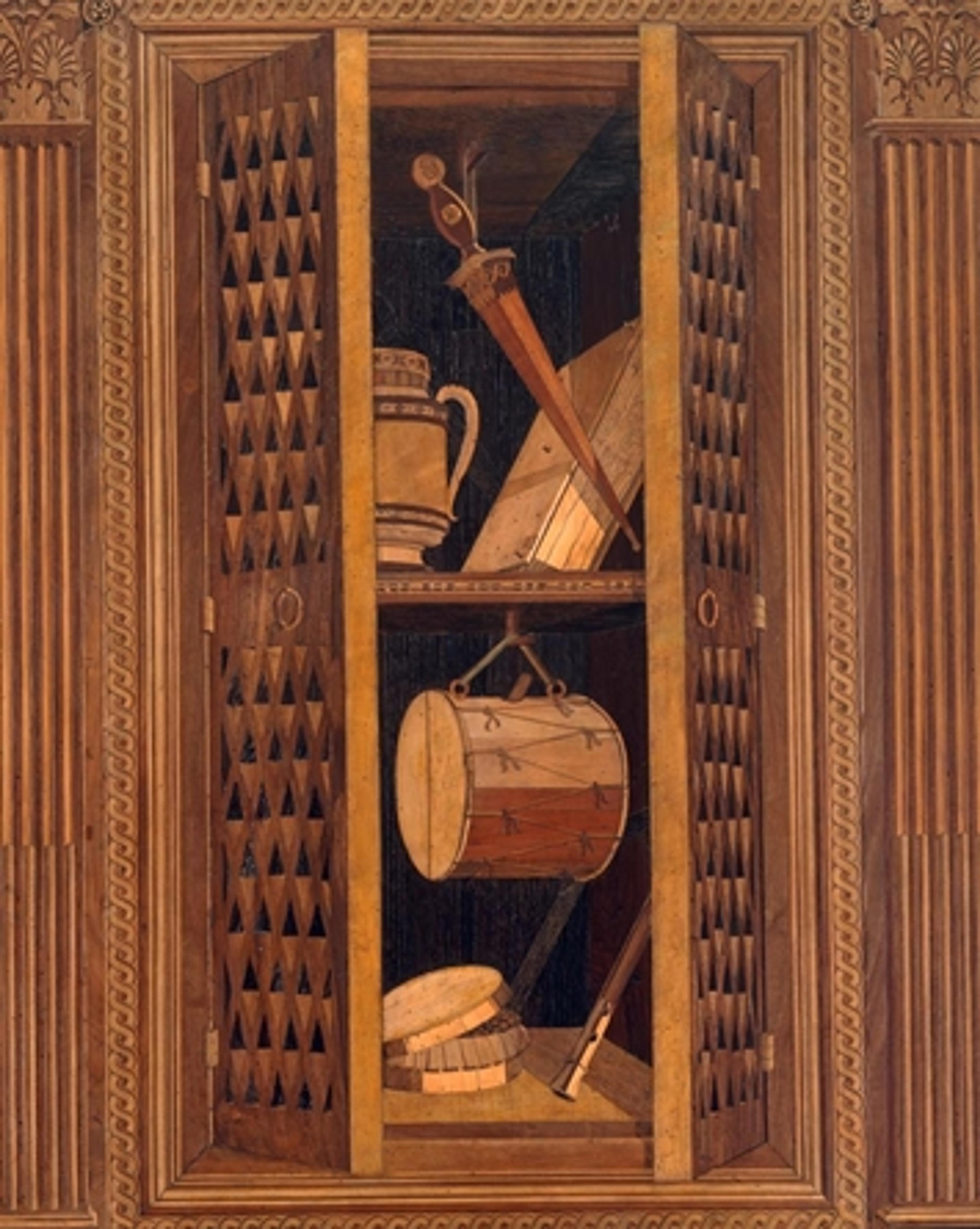 Left: Studiolo from the Ducal Palace in Gubbio (detail), ca. 1478–82. Designed by Francesco di Giorgio Martini (Italian, 1439–1501). Italian, Gubbio. Walnut, beech, rosewood, oak, and fruitwoods in walnut base, H. 15 ft. 10 15/16 in. (485 cm), W. 16 ft. 11 15/16 in. (518 cm), D. 12 ft. 7 3/16 in. (384 cm). The Metropolitan Museum of Art, New York, Rogers Fund, 1939 (39.153)