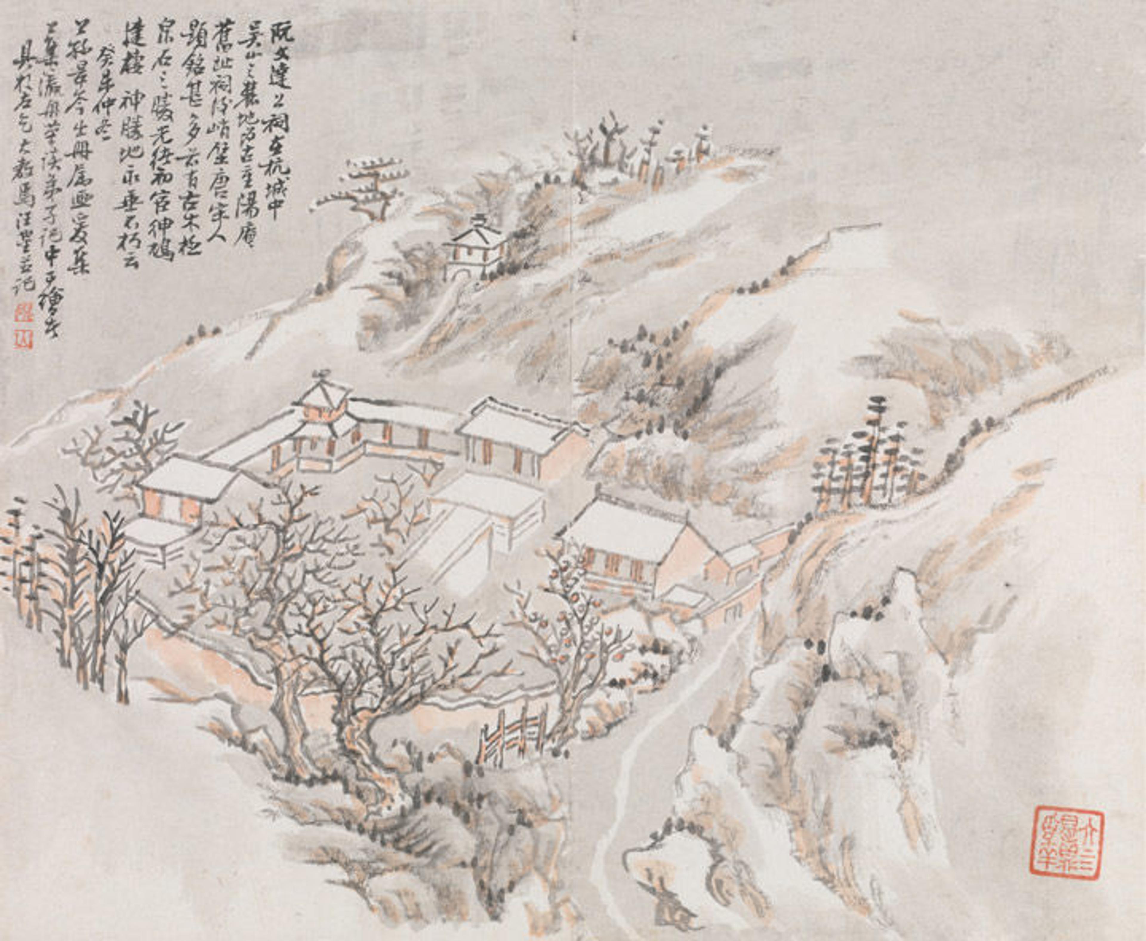 Most of the objects in the exhibition are taken from The Met collection; some are new acquisitions on view for the first time, while others have not been seen for many years. A few works that had been shown in partial view in past shows now enjoy a complete display, such as Wang Jun's (1816–after 1883) album on select sites in Yangzhou and Hangzhou (fig. 5), which serves as a pictorial biography of the eminent scholar-official Ruan Yuan (1764–1849). This new display of all 10 pictures in the album, rearranged in chronological order, enables a comprehensive and evolving view of the man's life.