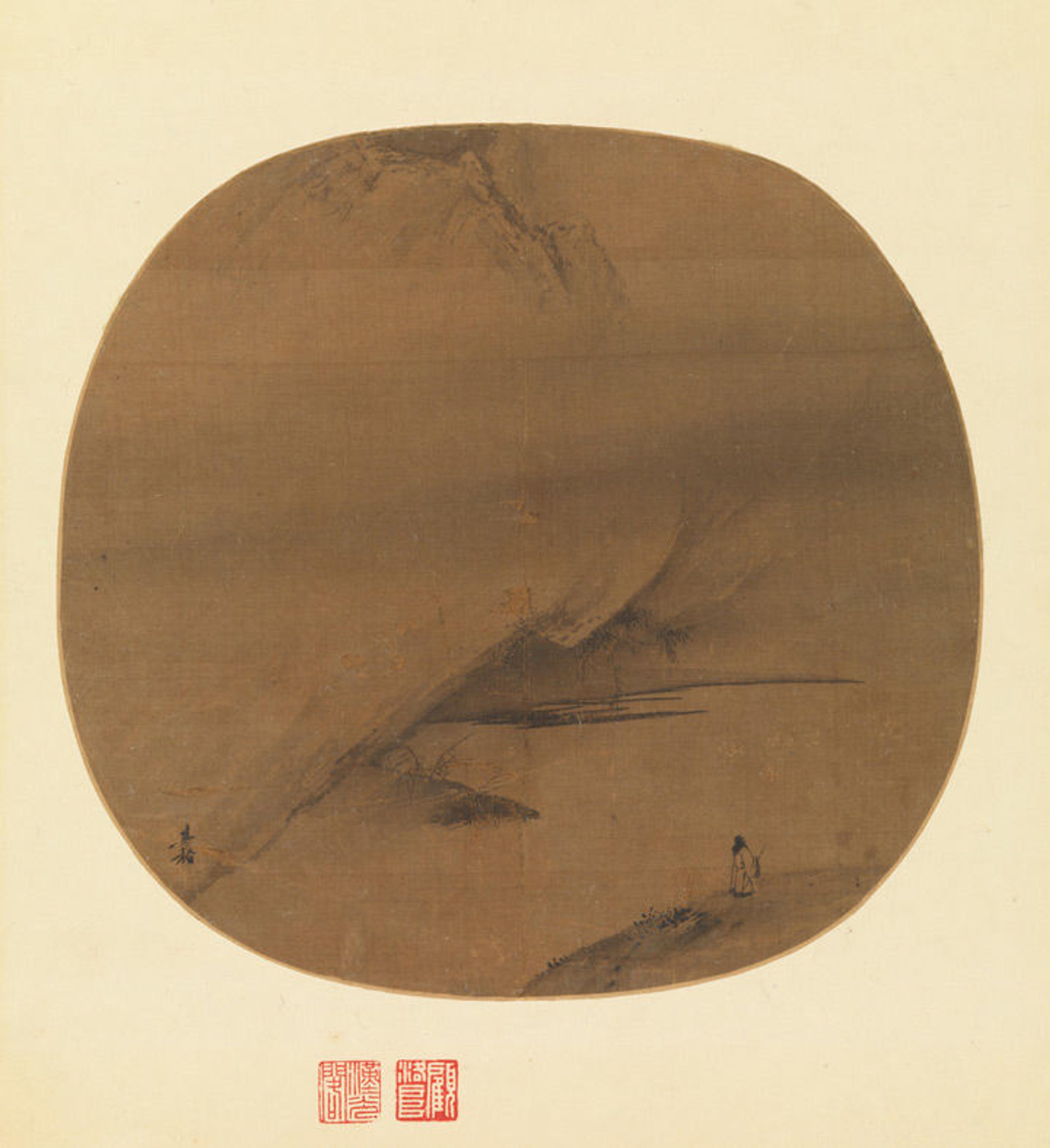 Fig. 3. Liang Kai (Chinese, active early 13th century). Poet Strolling by a Marshy Bank, early 13th century. Chinese, Southern Song dynasty (1127–1279). Fan mounted as an album leaf; ink on silk, 9 x 9 9/16 in. (22.9 x 24.3 cm). The Metropolitan Museum of Art, New York, Bequest of John M. Crawford Jr., 1988 (1989.363.14)