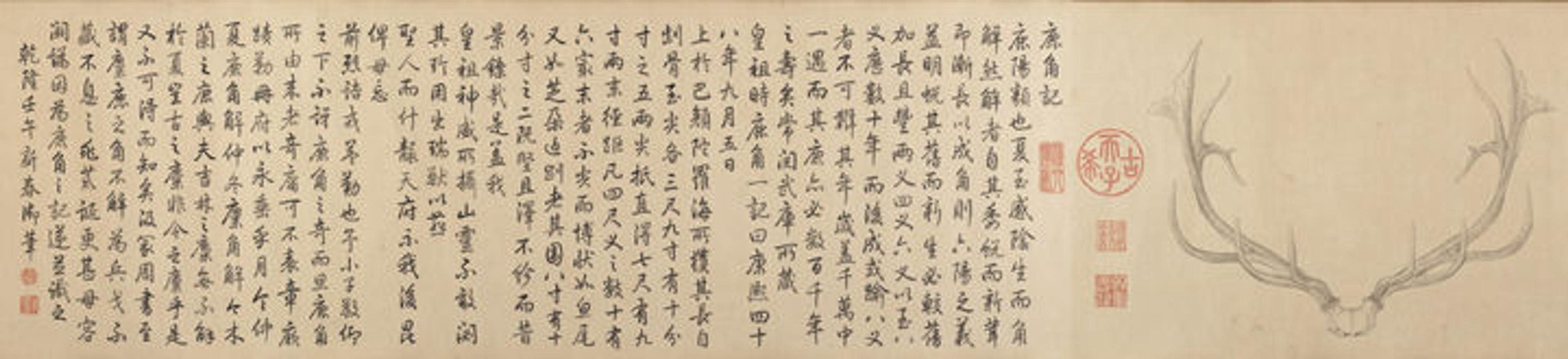 Fig. 4. Hongli (Qianlong Emperor, 1711–1799; r. 1736–95). Deer Antlers, dated 1762. One of two handscrolls; ink and color on paper, 9 3/4 x 81 1/4 in. (24.8 x 206.4 cm). The Metropolitan Museum of Art, New York, John Stewart Kennedy Fund, 1913 (13.220.127b)