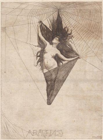The practice of seeing the spider in anthropomorphic terms is not new. In Greek mythology, the mortal woman Arachne challenged the goddess Athena to a weaving contest. For the folly of seeking to compete with a god, she was transformed into a spider. In this 1884 etching by Otto Henry Bacher, an American printmaker influenced by the manner of James McNeill Whistler, Arachne's hair merges with strands of the web, as the weaver finds herself ensnared.