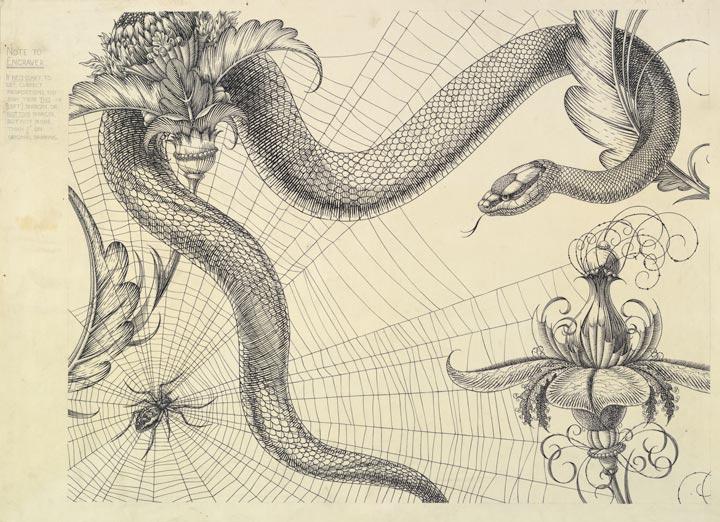 Danger and thrill, rather than industry, are the focus of Henry Weston Keen's stylized face-off between spider and snake. Keen, a designer of book illustrations in the symbolist tradition, produced this elegant but macabre drawing to be engraved and printed as the endpaper for an edition of dramatist John Webster's tragedy The White Devil and the Duchess of Malfi published in London in 1930.
