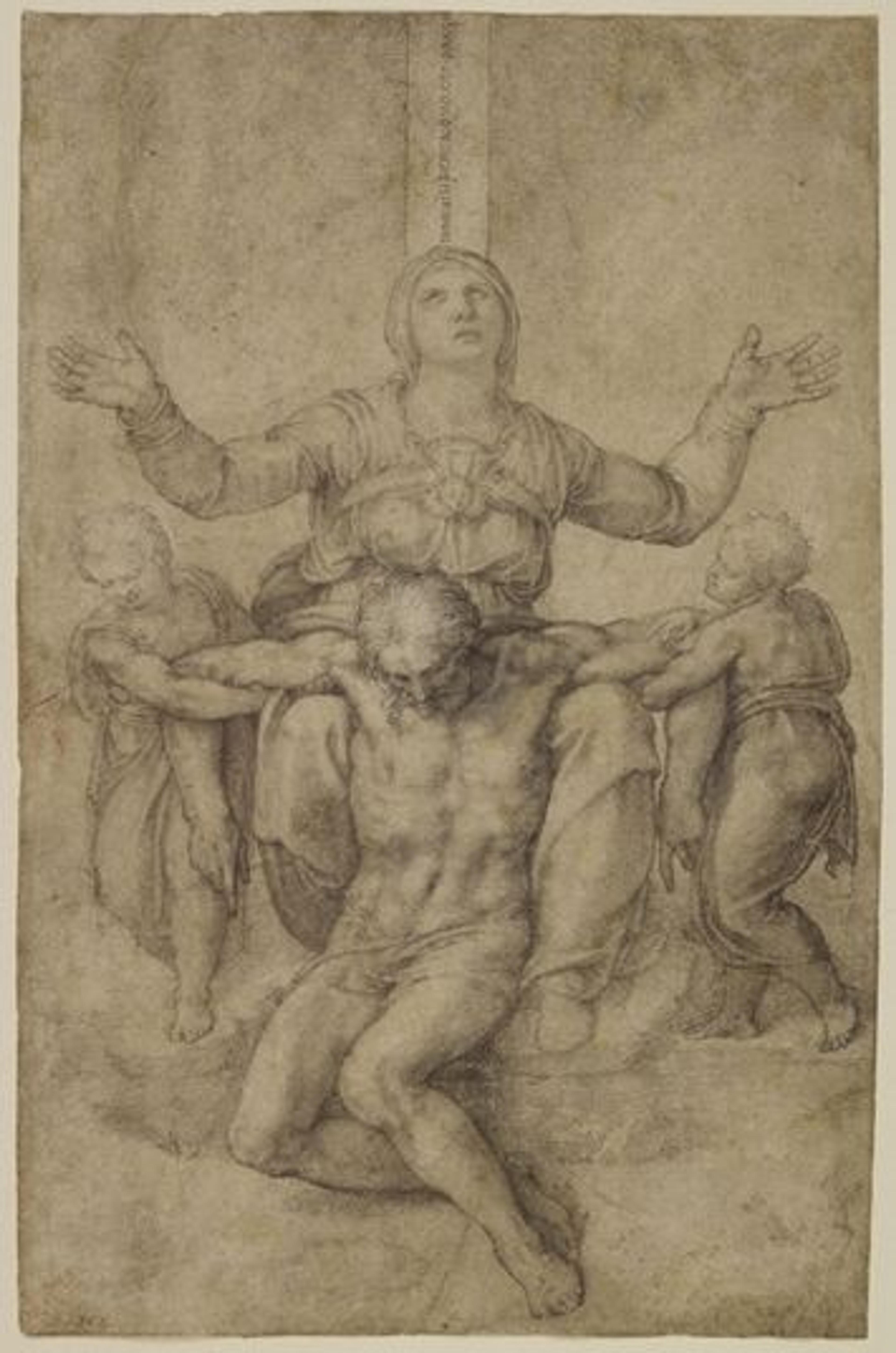 Right: Michelangelo Buonarroti (Italian, 1475–1564). Pietà for Vittoria Colonna. Black chalk on paper, 11 3/8 x 7 7/16 in. (28.9 x 18.9 cm). Isabella Stewart Gardner Museum, Boston (1.2.0.16)