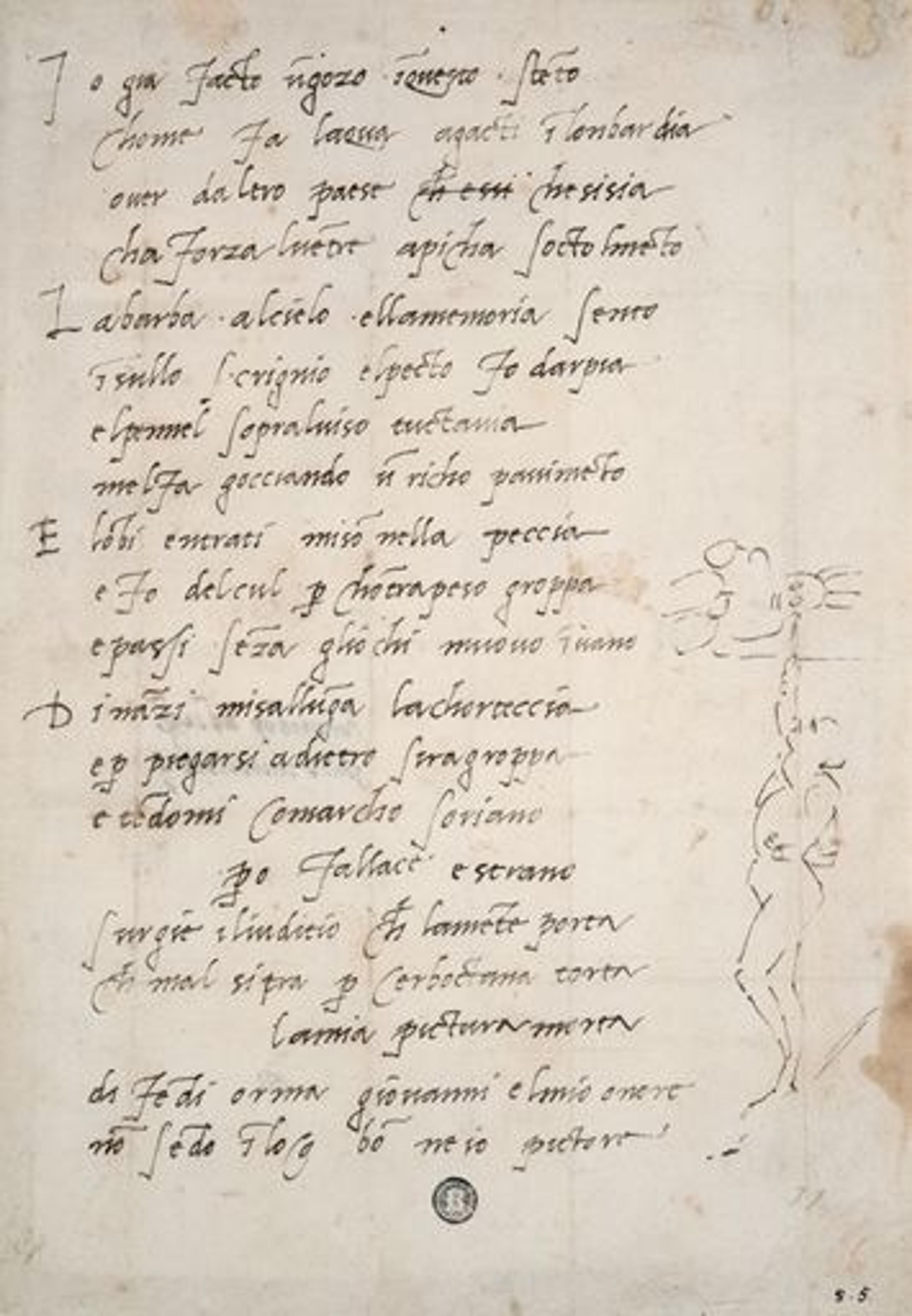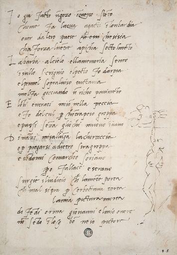 Left: Michelangelo Buonarroti (Italian, 1475–1564). Sonnet "To Giovanni da Pistoia" and Caricature on His Painting of the Sistine Ceiling. Pen and brown ink, sheet: 11 1/8 x 7 7/8 in. (28.3 x 20 cm). Casa Buonarroti, Florence Archivio Buonarroti (XIII, fol. 111)