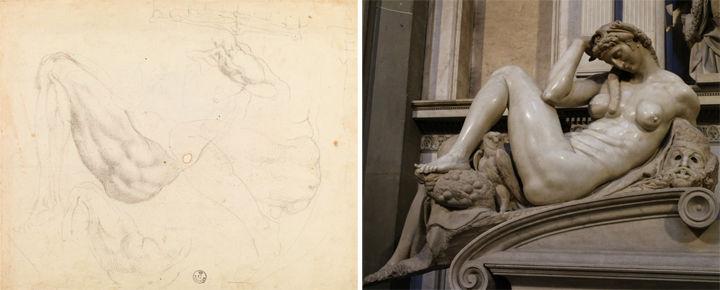 Left: Michelangelo Buonarroti (Italian, 1475–1564). Studies for Night in the New Sacristy of San Lorenzo and Other Anatomical Motifs. Grayish black chalk, 11 x 13 1/2 in. (28 x 34.3 cm). Gallerie degli Uffizi, Gabinetto dei Disegni e delle Stampe, Florence, (18719 F). Right: Detail of Michelangelo's Night sculpture in the Tomb of Giuliano de' Medici in the New Sacristy, Church of San Lorenzo, Florence. Public-domain image