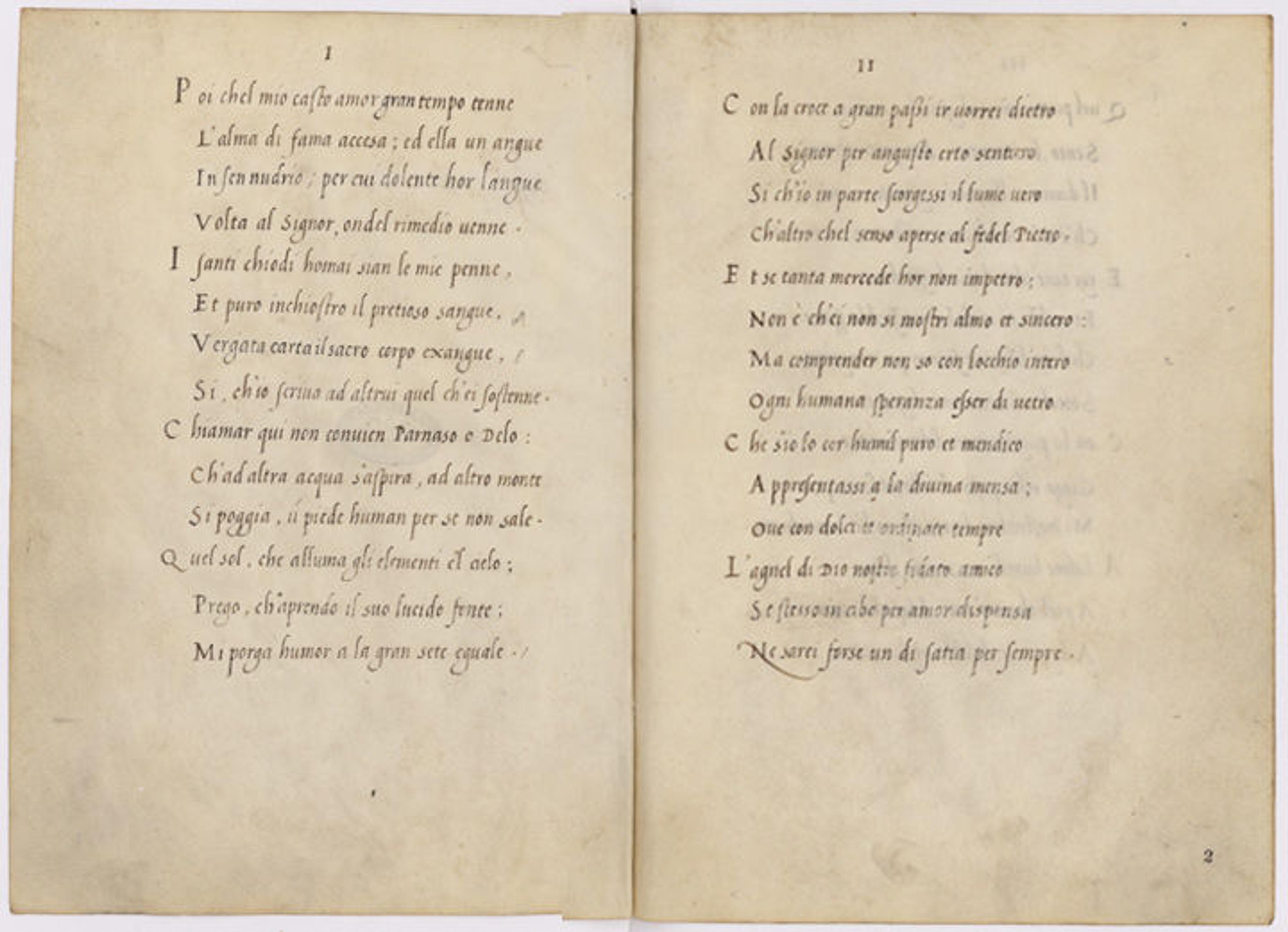 Vittoria Colonna (Italian, 1492–1547). Rime Spirituali (sonetti spirituali / della sig.ra Vittoria). Bound manuscript, opened to folios 1v-2r. Biblioteca Apostolica Vaticana, Vatican City (Cod. Vat. Lat. 11539)