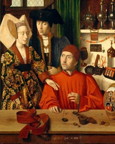 Right: Petrus Christus (Netherlandish, active 1444–1475/6). A Goldsmith in his Shop, 1449. Oil on oak panel, 39 3/8 x 33 3/4 in. (100.1 x 85.8 cm). The Metropolitan Museum of Art, Robert Lehman Collection, 1975 (1975.1.110)