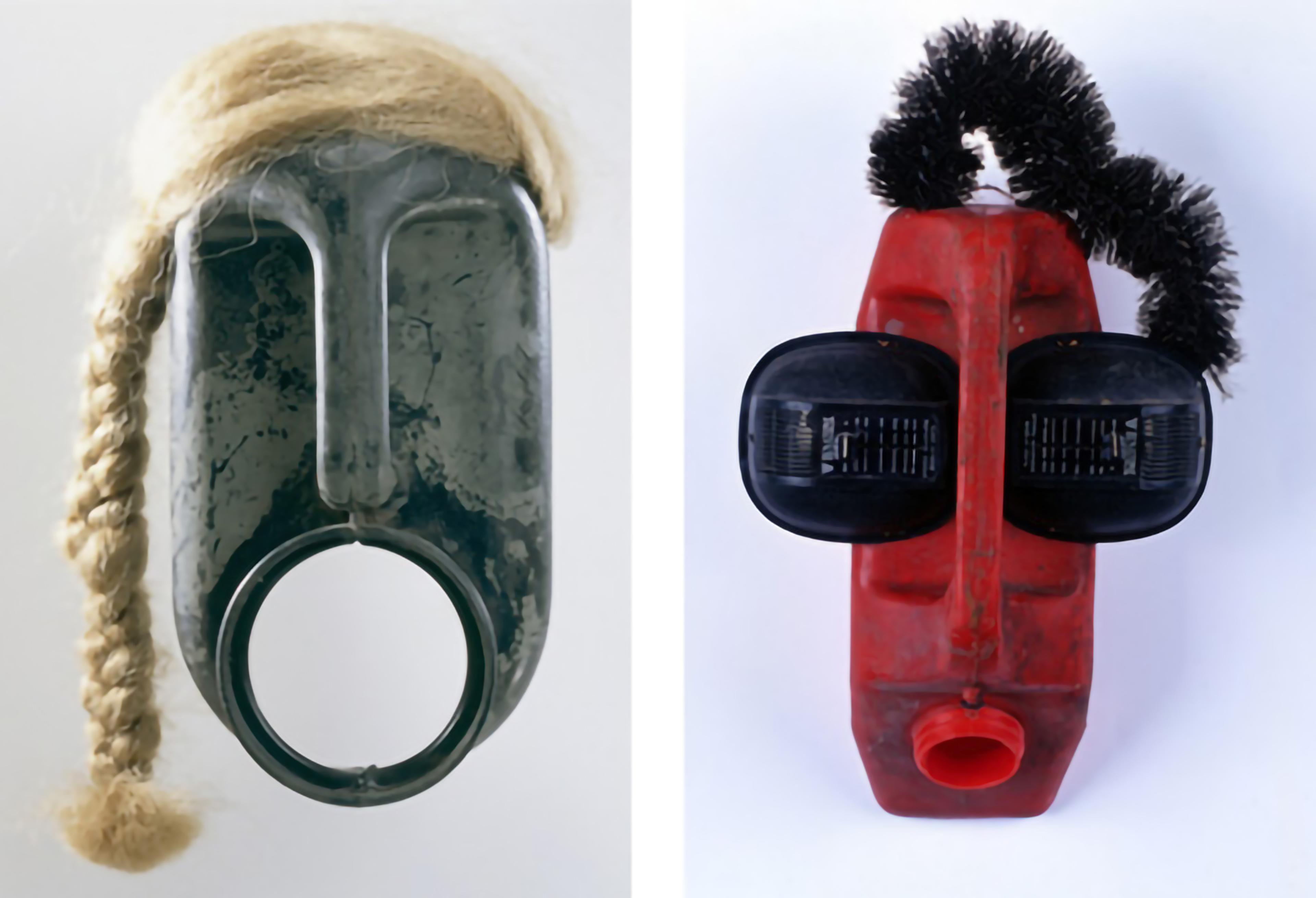 Romuald Hazoumé (Beninese, b. 1962). Left: Coconut, 1997. Plastic can, synthetic hair, metal, nylon; 14 1/2 x 8 5/8 x 5 7/8 in. (37 x 22 x 15 cm). Right: Ear Splitting, 1999. Plastic can, brush, speakers; 16 1/2 x 8 5/8 x 6 1/4 in. (42 x 22 x 16 cm). Both: Courtesy CAAC - The Pigozzi Collection, Geneva. © Romuald Hazoumé