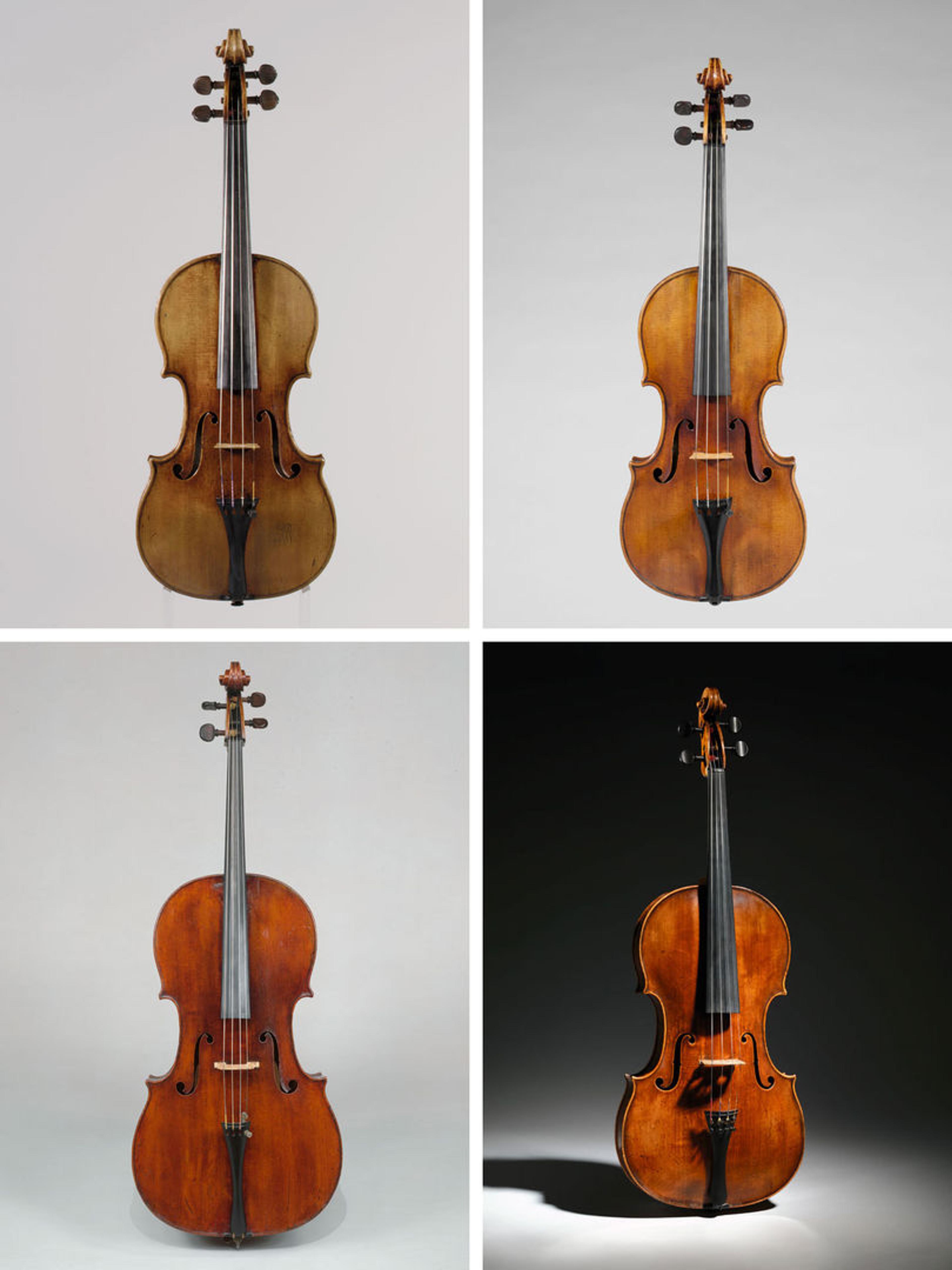 Clockwise from top left: Antonio Stradivari (Italian, 1644–1737). "The Antonius" Violin, 1711. Maple, spruce, ebony. The Metropolitan Museum of Art, New York, Bequest of Annie Bolton Matthews Bryant, 1933 (34.86.1 a). Antonio Stradivari (Italian, 1644–1737). "The Francesca" Violin, 1694. Maple, spruce, ebony. The Metropolitan Museum of Art, New York, Bequest of Annie Bolton Matthews Bryant, 1933 (34.86.2 a). Jacob Stainer (Austrian, ca. 1617–1683). Viola, ca. 1660. Spruce, maple, blackwood. The Metropolitan Museum of Art, New York, Purchase, Robert Alonzo Lehman Bequest, Fletcher Fund, 2012 Benefit Fund and Beatrice Francais Gift, 2013 (2013.910). Jean Baptiste Vuillaume (French, 1798–1875). Violoncello, mid-19th century. Spruce and maple. The Metropolitan Museum of Art, New York, Gift of Dr. Peter Blos, 1984 (1984.114.1)
