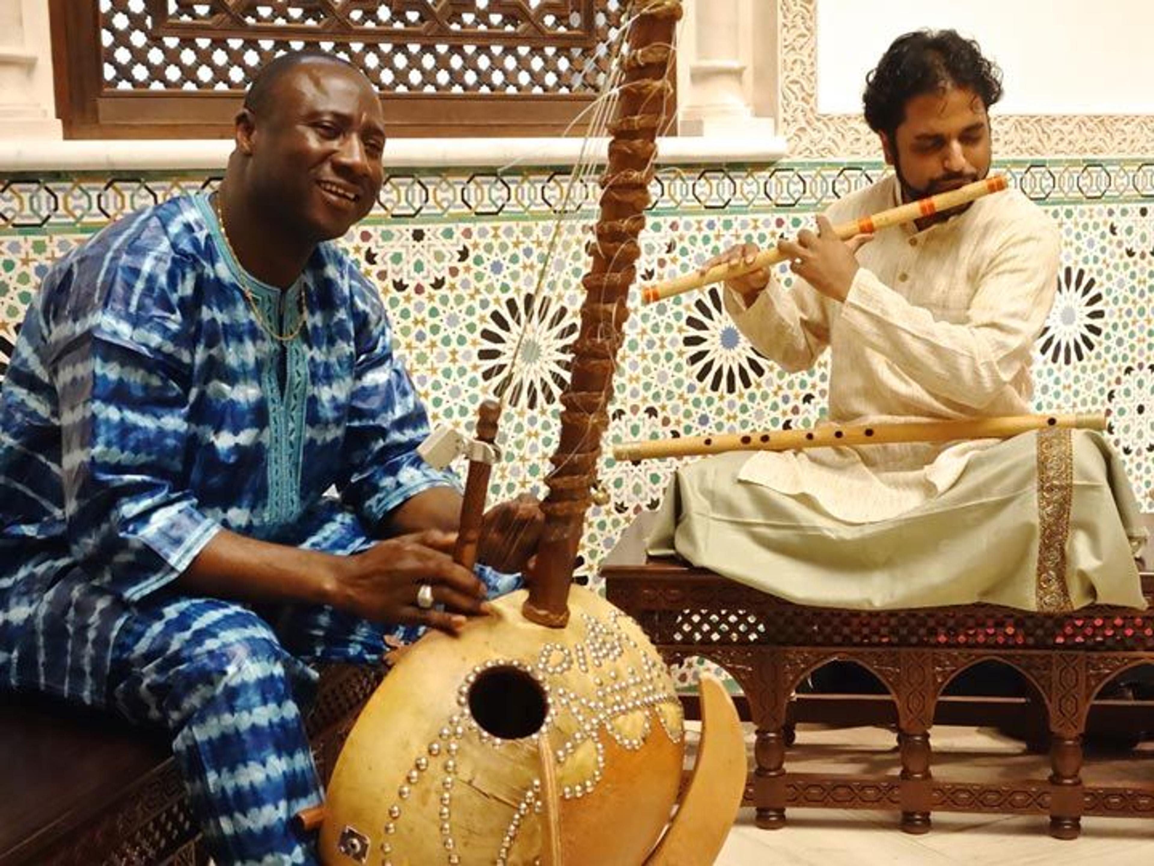 To inaugurate the series in April 2014, we welcomed Brandon Terzic and Ehren Hanson for a program of music featuring the oud (an Arabic stringed instrument) and the tabla (an Indian drum). This first collaboration represented a cross-cultural blending of instruments and traditions that has become central to the vision of the series. Performers have introduced over 20 instruments from countries such as Egypt, Iran, Turkey, India, and Iraq, and while some groups have chosen traditional pairings, such as tabla and sitar, others have opted to combine instruments in more novel arrangements. One of the most magical was that of Yacouba Sissoko playing the kora (a West African stringed instrument often described as a combination of the harp and lute) and Jay Gandhi playing the bansuri (a South Asian flute).