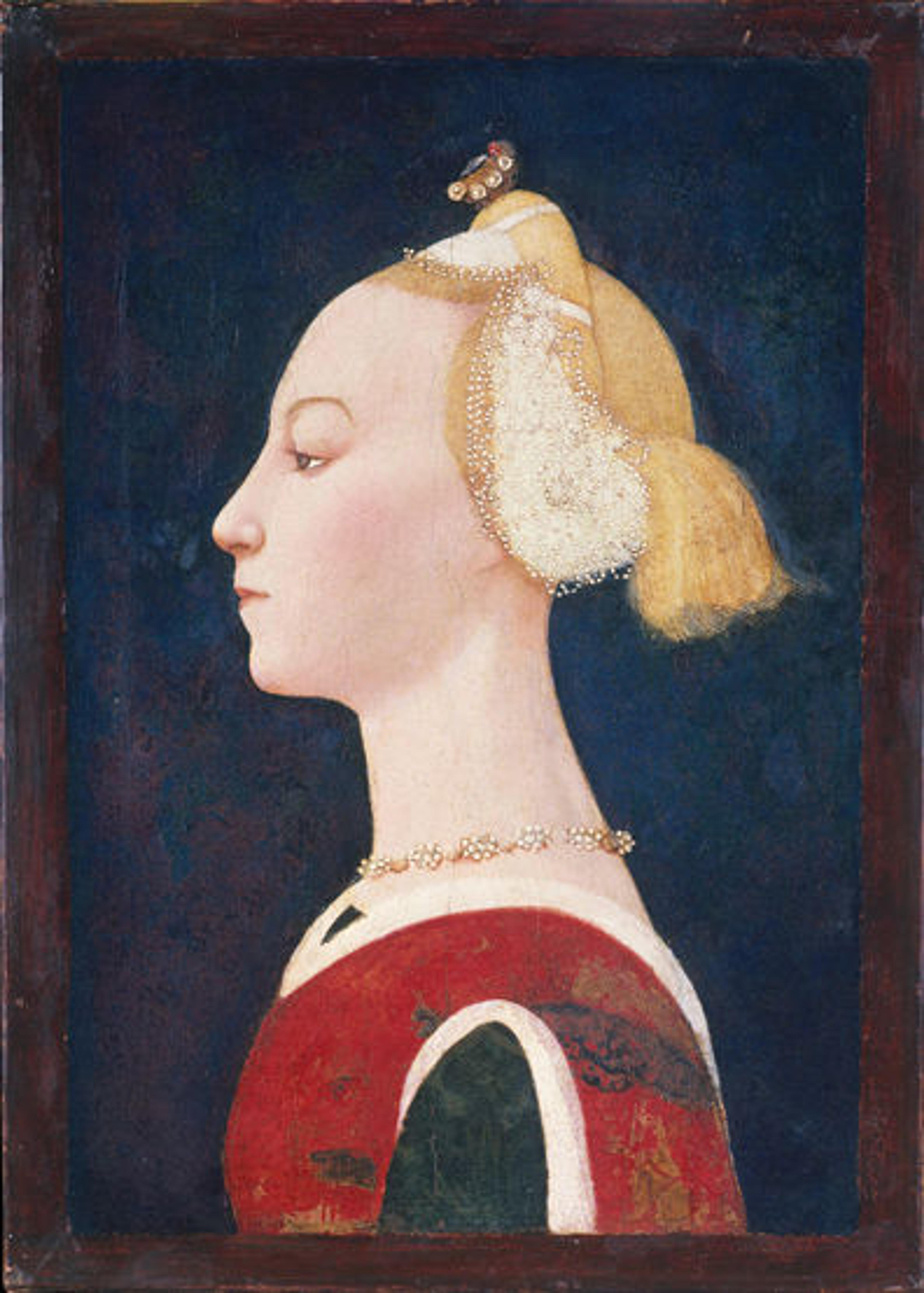 The profile format was popular for bridal portraits in the fifteenth century. Some say this is because of the influence of the Renaissance interest in antiquity (ancient Roman coins and medals, studied at the time, depicted rulers in profile). The profile is also the best way to view someone's physical features. Poetry written by the fourteenth-century writer Petrarch described the ideal woman and her beauty: the ideal woman had blonde hair (which was often dyed), a high forehead (often created by plucking hairs from the hairline with tweezers), pale skin, and a long neck. People in the Renaissance believed that a woman's physical characteristics were a reflection of her beauty on the inside.