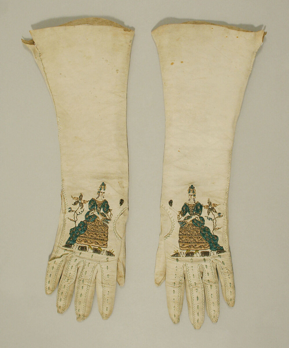 The embroidered figure on these gloves is a lady in court dress complete with the fontanges, the hairstyle in vogue during the first decade of the eighteenth century. It is unusual to find a historical costume depicted on a fashionable accessory. It must have amused the lady who wore the gloves to compare the style of her grandmother’s day to the attire of her own time.