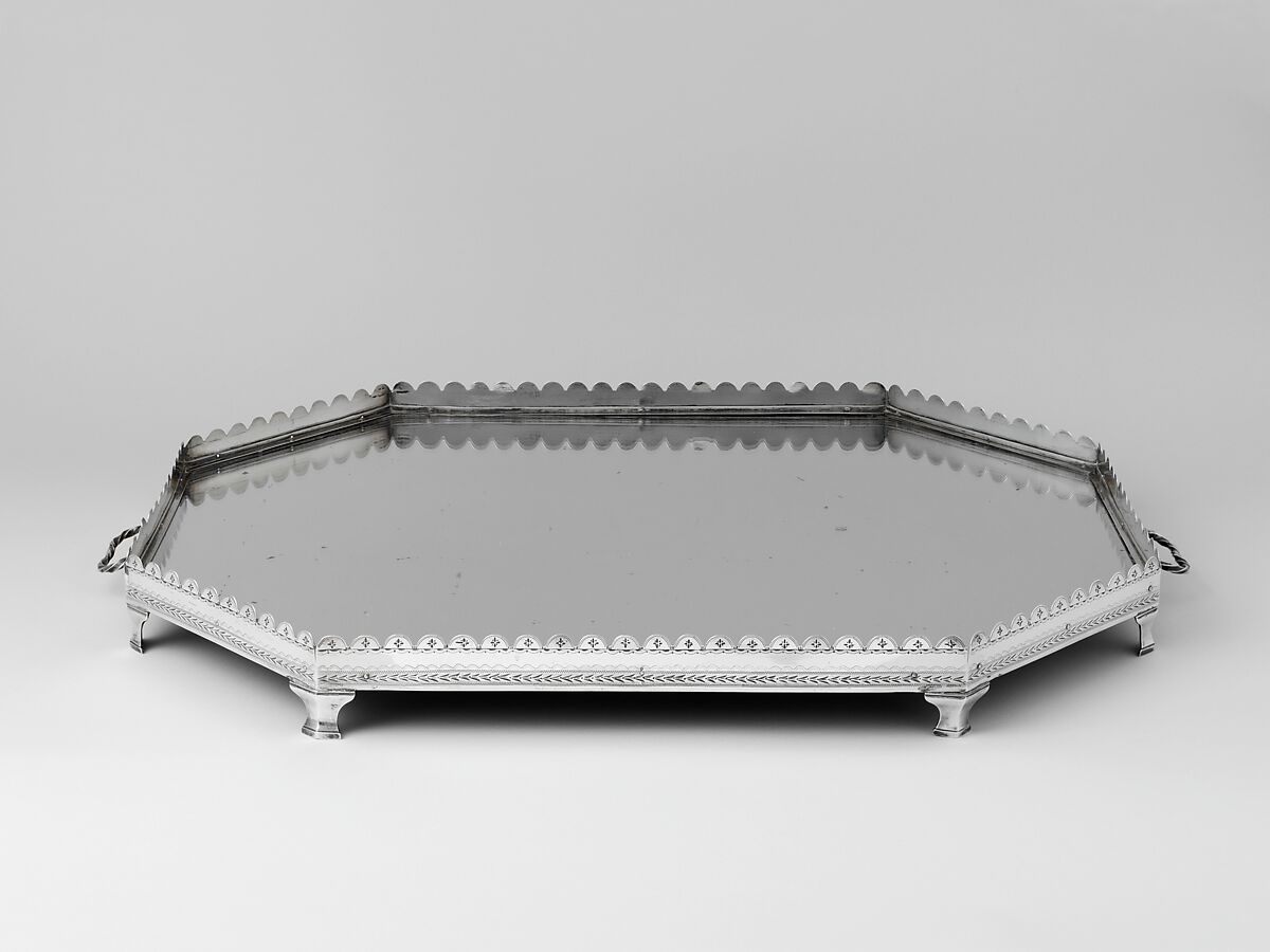 Table centerpieces constructed of silver and mirrored glass were rarely made in America; only three are known today, one of which is in the American Wing’s collection (see 1993.167). This octagonal example marked by the New York silversmith Benjamin Halsted displays the clean, spare lines of Neoclassical design. Its eight cast feet are soldered to a sheet copper base, onto which are pinned engraved silver borders and a simple inner molding that secures the mirrored expanse. The twisted wire handles were added later to facilitate lifting and carrying.