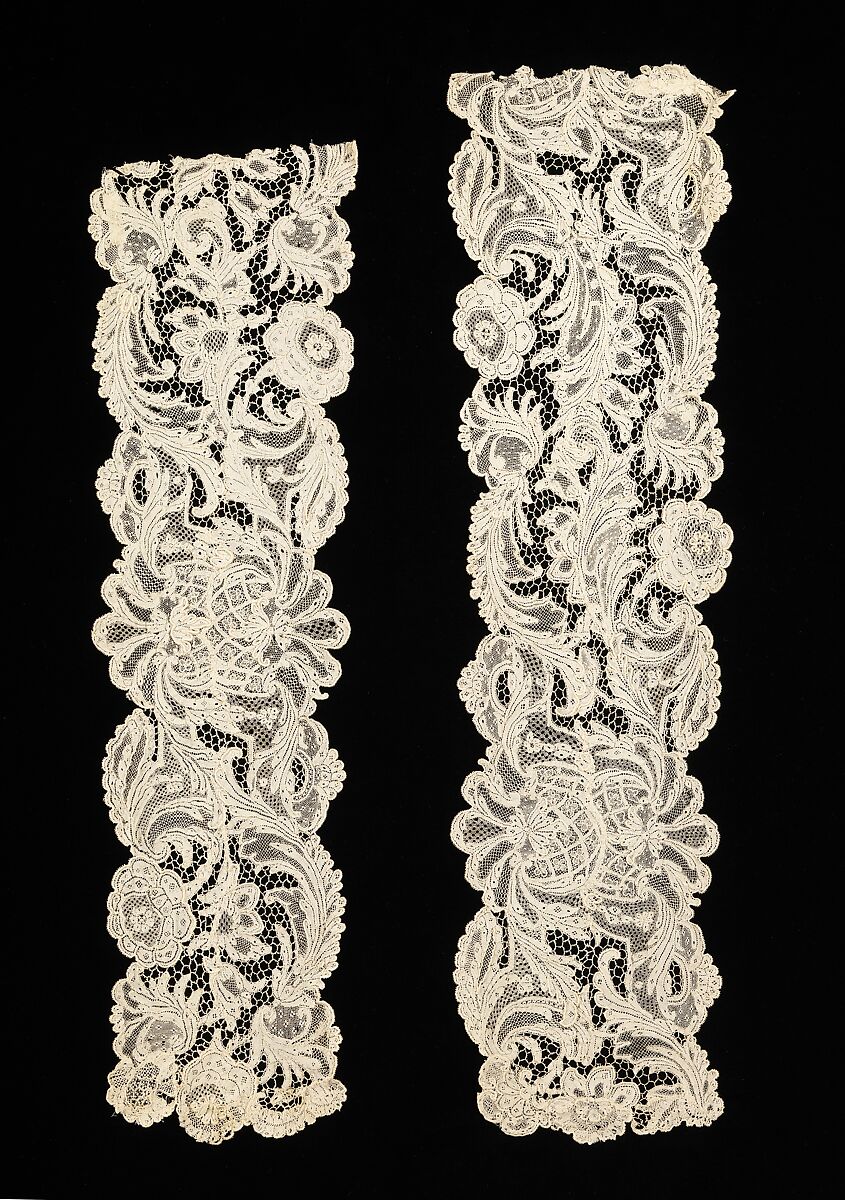 Fine pieces of lace were often reconfigured from their original forms as they passed from one generation to another. These lappets were made by cutting from a single length. The variety of fillings and the compelling movement and dynamism of the design mark it as a high quality piece.