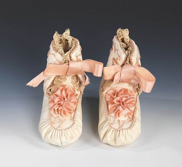 The exuberant embellishment of these two pairs of infant's booties expresses the style of 1890s, when rich ornament was featured in many areas of the decorative arts. Booties of this type would have been worn for presentation purposes, at a christening or some such important event. They are beautifully crafted throughout, including the lining, and feature decorative stitching at the toe seam and meticulously executed lace ruffles. The two pairs were worn by the same baby girl, demonstrating that our current rule of blue for boys and pink for girls was not yet codified at the turn of the century. Prior to this time, pink had been favored as a more vigorous color suitable for boys and blue as a passive color suitable for girls. Despite the ambiguous color coding system, the blue pair here does feature an external lacing rather than a ribbon bow, a simple bow knot in place of the rosette, and exclusion of embroidery, all elements which give the booties a more masculine appearance.