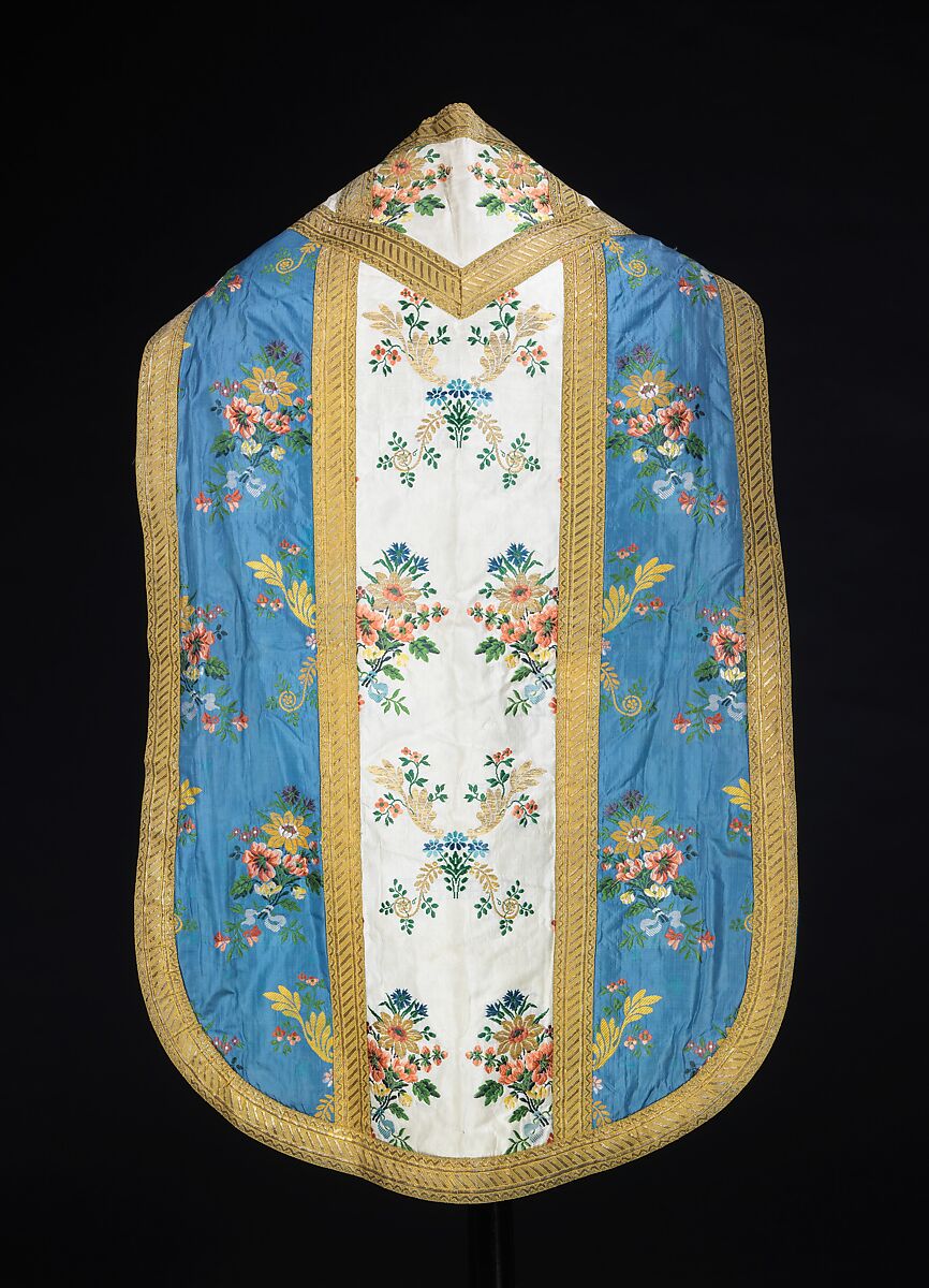 Synergizing centuries' old Catholic practice with Industrial Age France, the two floral silks decorating this priest's vestment- a tabard-like Chasuble intended to be worn over the alb and other clothing when officiating church services- were woven on a Jacquard loom, using synthetic dyes. The whole is edged and ornamented with machine-woven gold-colored braid. The front of the garment's exaggerated tear-drop shape was fashionable throughout the nineteenth century.