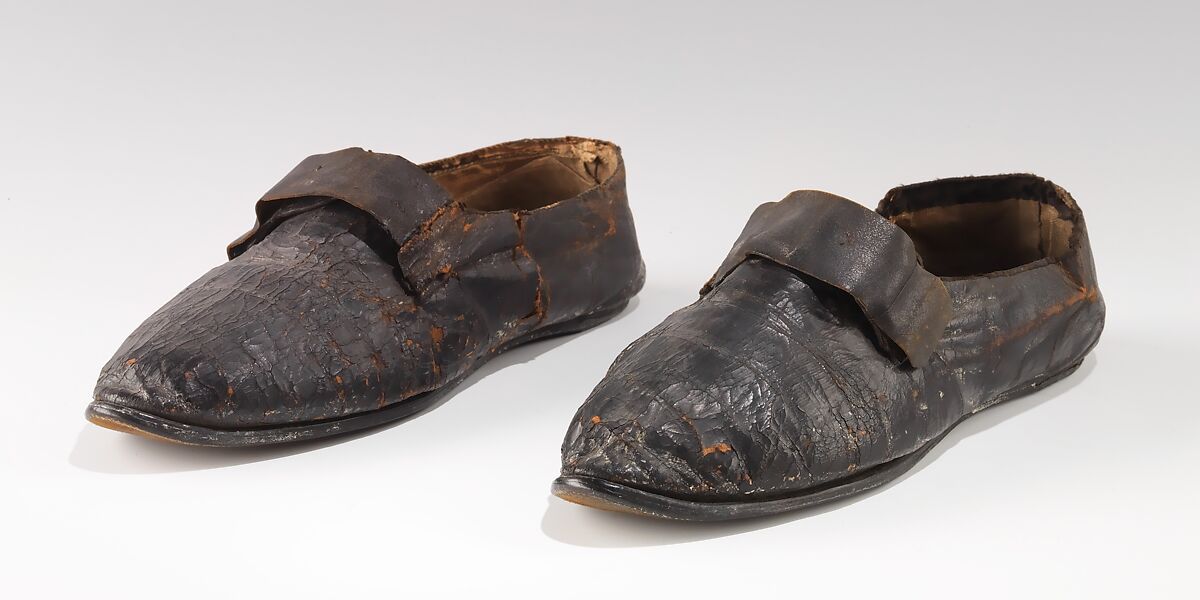 Due to their scarcity, early men's everyday shoes are interesting to the costume historian, even when altered from their original state. The combination of features on this pair of shoes had confused previous collectors over the past two centuries, who had attributed various dates: "Cromwellian" (1649-1653), "Stuart” (1603-1714), or “18th Century". Advances in scholarship and careful examination can shed some light on the mystery. The outstanding feature on these shoes is the long latchet which would have held a buckle in the late 17th or 18th century, however close examination reveals that the shoes are constructed as tie shoes, with the long latchet added. This laced closure is not generally seen before the end of the 18th century and furthermore, the latchets on these shoes do not show the same degree of wear as the rest of the shoes, both aspects which suggest the shoes may have been altered for historical fancy dress. The flat heel is also not a feature one would expect in the earlier period. The general style with rounded toe, covered tongue, no rand, flat heel, and tie closure suggests date of between 1790 and 1825.