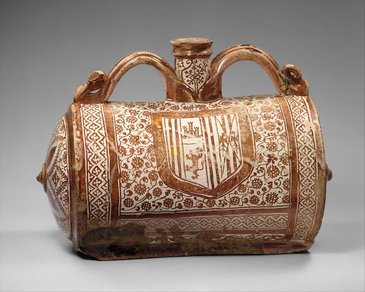 This bottle, possibly a version of the hanging leather pilgrim flask used during journeys, would have been used to cool wine in a larger container of water and, although few have survived, was presumably quite a commonly seen form at one time. The arms within a shield on the side are those of Enrique of Aragon-Segorbe, lord of Paterna, or of his son Alfonso, who succeeded him as lord of Paterna in 1516.