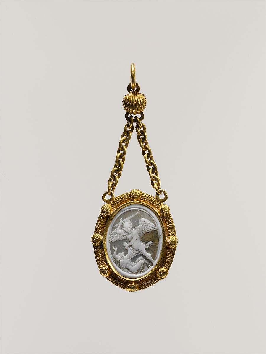 Both sides of this pendant contain shell cameos with almost mirror images of the archangel Michel, patron saint of France, slaying the dragon, symbolizing the fight against evil. The badge belonged to a member of the Royal Order of Saint Michel, which was founded by Louis XI in 1469.