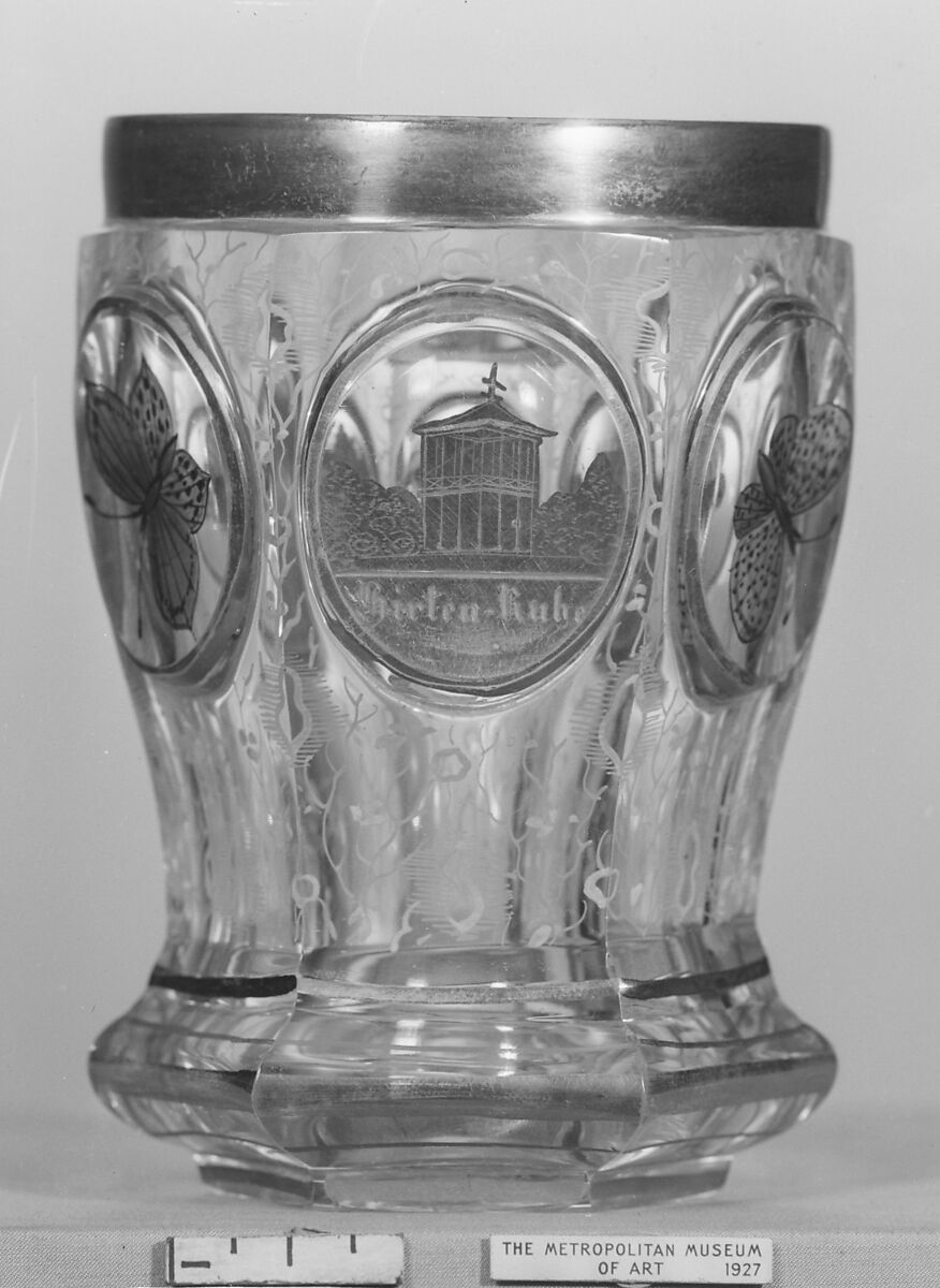 This beaker and its matching decanter (27.185.244a,b) are decorated with enamelled medallions with representations of spa buildings and beauty spots in the Bohemian health resort of Mariánské Lázne, then known as Marienbad. Those on the decanter are identified as Waldquelle (now Lesní pramen or Forest source), Carolinenbrunn (Karolinin pramen or Caroline's spring), Ambrosiusbrunn (Ambrožovy prameny or Ambrosius springs) and Kreuzbrunn (Krížovy pramen or Cross spring). Those on the beaker are of Hirten-Ruhe (Hirtenruhe), Friedrich-Wilhelms-Höhe (Výšina Bedricha Viléma or Frederick William Heights), and Ferdinandsbrunn (Ferdinanduv pramen or Ferdinand's spring).