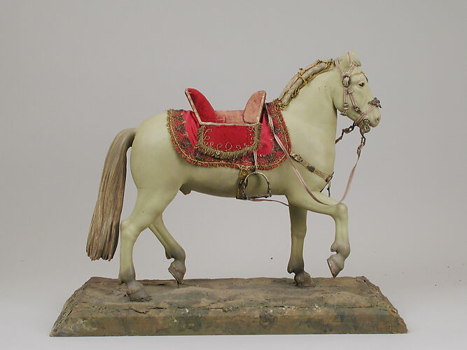 - Medium: Polychromed terracotta body; wooden legs and tail; velvet covered wooden saddle; satin saddle blanket with metallic thread; gold braided girth and neck strap with silver buckles; silver braided martingale, bridle and reins; gold braided mane; silver stirrups