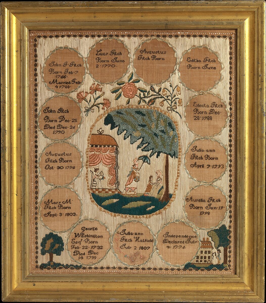 Das Hauptbild dieses Familienchronik-Sticktuchs von Julia-Ann Fitch aus Hatfield, Massachusetts, zeigt eine sitzende junge Dame, die ein Buch zum damals heiß diskutierten Tagesthema, Bildung für Frauen, liest. 13 Kreise umringen den Mittelkreis; die meisten enthalten die Namen und Daten Julia-Anns direkter Familienmitglieder. Sie demonstrierte auch ihren Patriotismus: Einer der unteren Kreise ist eine Hommage an George Washingtons Leben und seinen kurz zurückliegenden Tod 1799 und ein anderer zeigt das Geburtsdatum der neuen Nation.