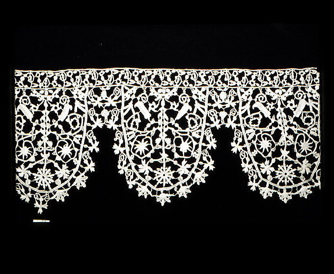 Punto in aria—literally, "stitches in the air"—is one of the earliest styles of needle lace, which is itself developed from cutwork of primarily geometric design. When lacemakers transitioned to using a foundation of threads laid out according to a pattern drawn on parchment, they were able to incorporate more fluid lines and curves into their designs.
