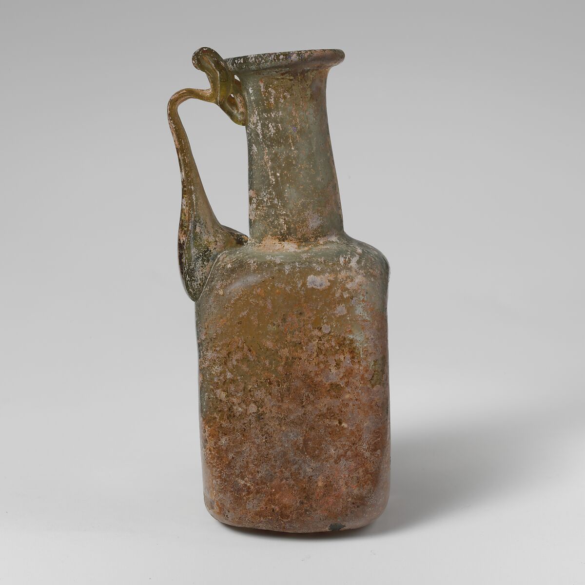 Rim folded out, over, and in; cylindrical neck, tapering downward and aslant to body, with tooling marks around base; horizontal, rounded shoulder; uneven, slightly indented sides to body; uneven, rectangular bottom; claw handle applied to sholuder with two large pads extending to top of side, drawn up and out, then turned in horizontally and trailed with upward projecting loop on to edge of rim and top of neck. Unstable on bottom.