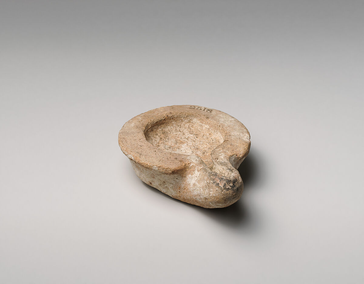 Hand-made. Broad, horizontal rim, ending at back of nozzle; shallow, open reservoir, sloping downward to front; long, rounded nozzle, with open channel for wick. Undefined, flat base.
