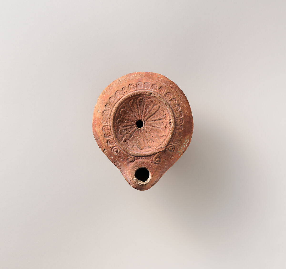 Vessberg Type 13. Mold-made. Discus: rosette of twelve slender round petals interspersed with four pointed, slender leaves; a single, small filling hole at center; raised ridge around edge of discus. Sloping shoulder: small ovules around inner edge. Round nozzle; a pair of impressed circles as stylized volutes at each side of back of nozzle. Raised base ring, and broad, flat base; small impressed circle at center.