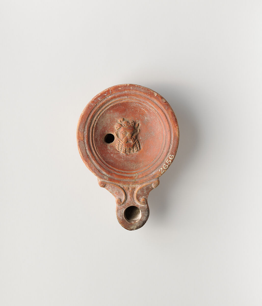 Loeschcke Type 4. Mold-made. Discus: facing head of Silenos at center; a single filling hole at center left; band of lines and grooves towards edge. Volutes flanking nozzle. Incised base ring, and slightly pushed-in base; a horizontal line across center of base as a maker's mark.