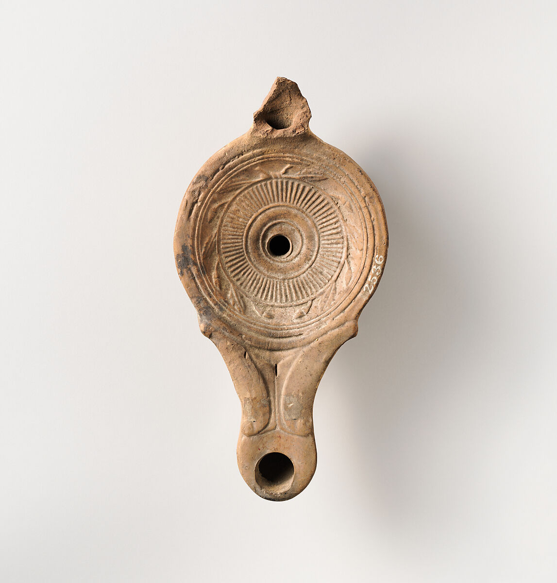 Broneer Type 21. Mold-made, with ring handle and ornament above. Discus: a band of close-set radiating lines within an oak wreath; a single central filling hole surrounded by a single raised line; a narrow band of lines and grooves at edge of discus. A narrow, plain shoulder. Elongated volutes flanking long nozzle, forming a channel with a tiny slit, and a large wick hole. Poorly-defined raised base ring, and slightly concave base.
